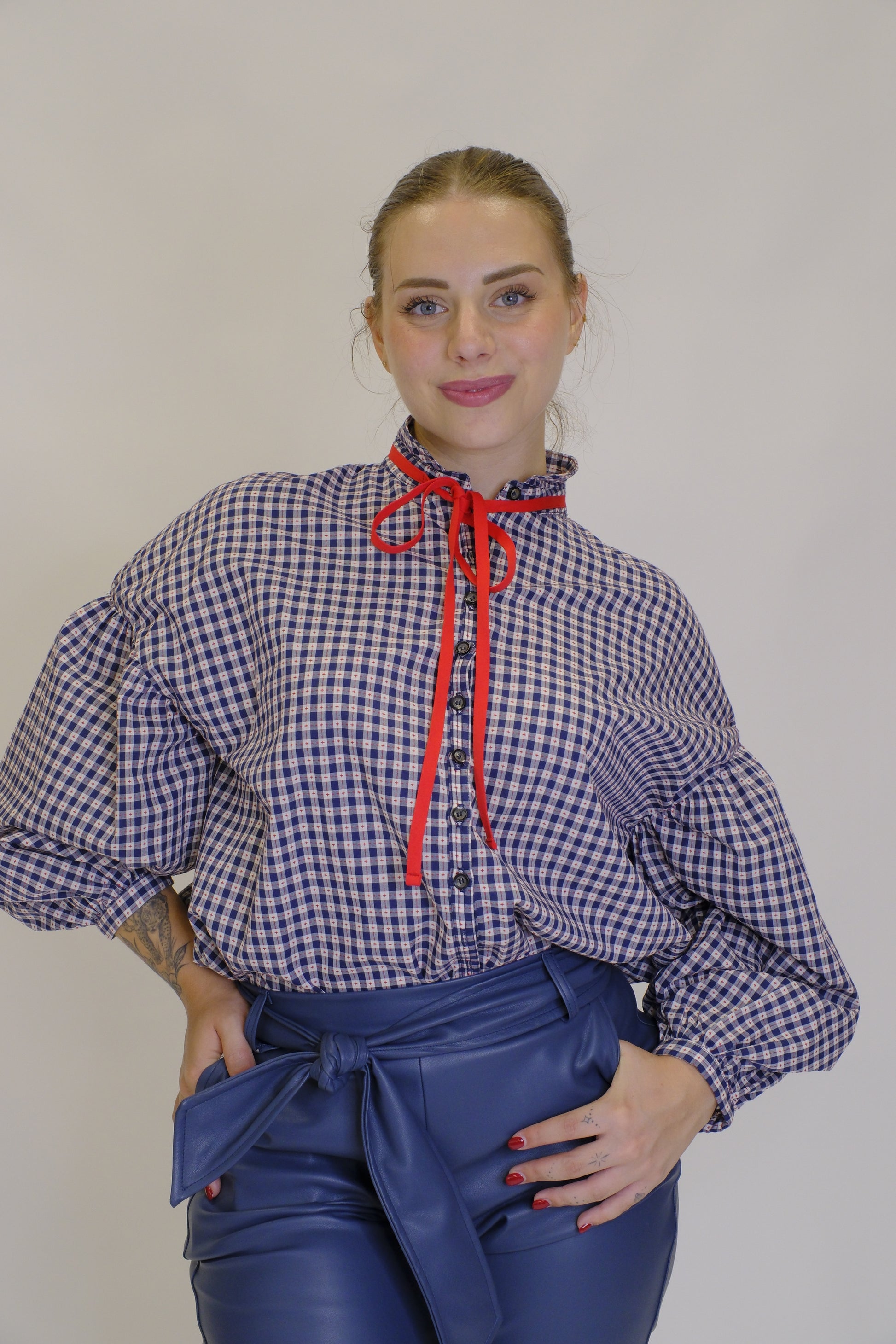 Camicia Quadretti Nastro Sul Collo - BLUE