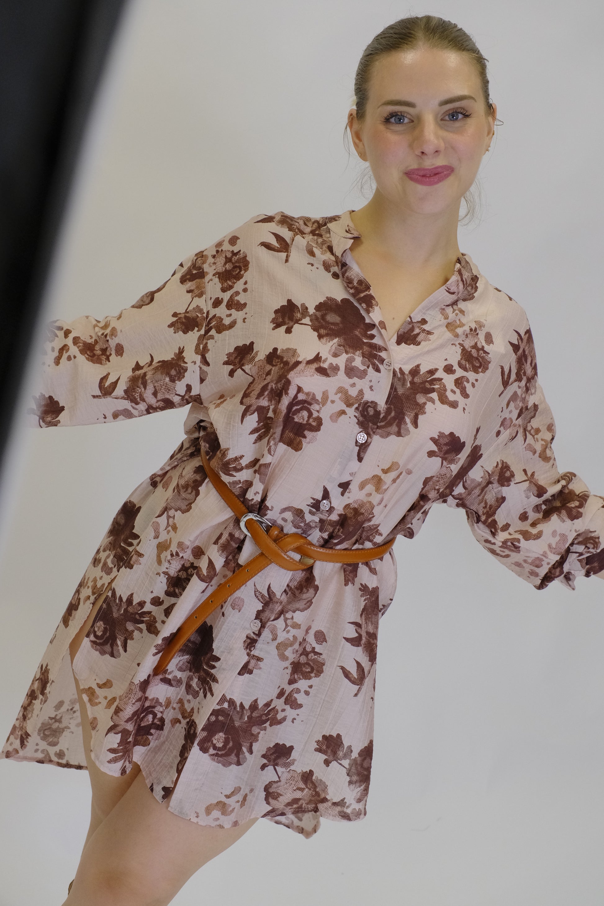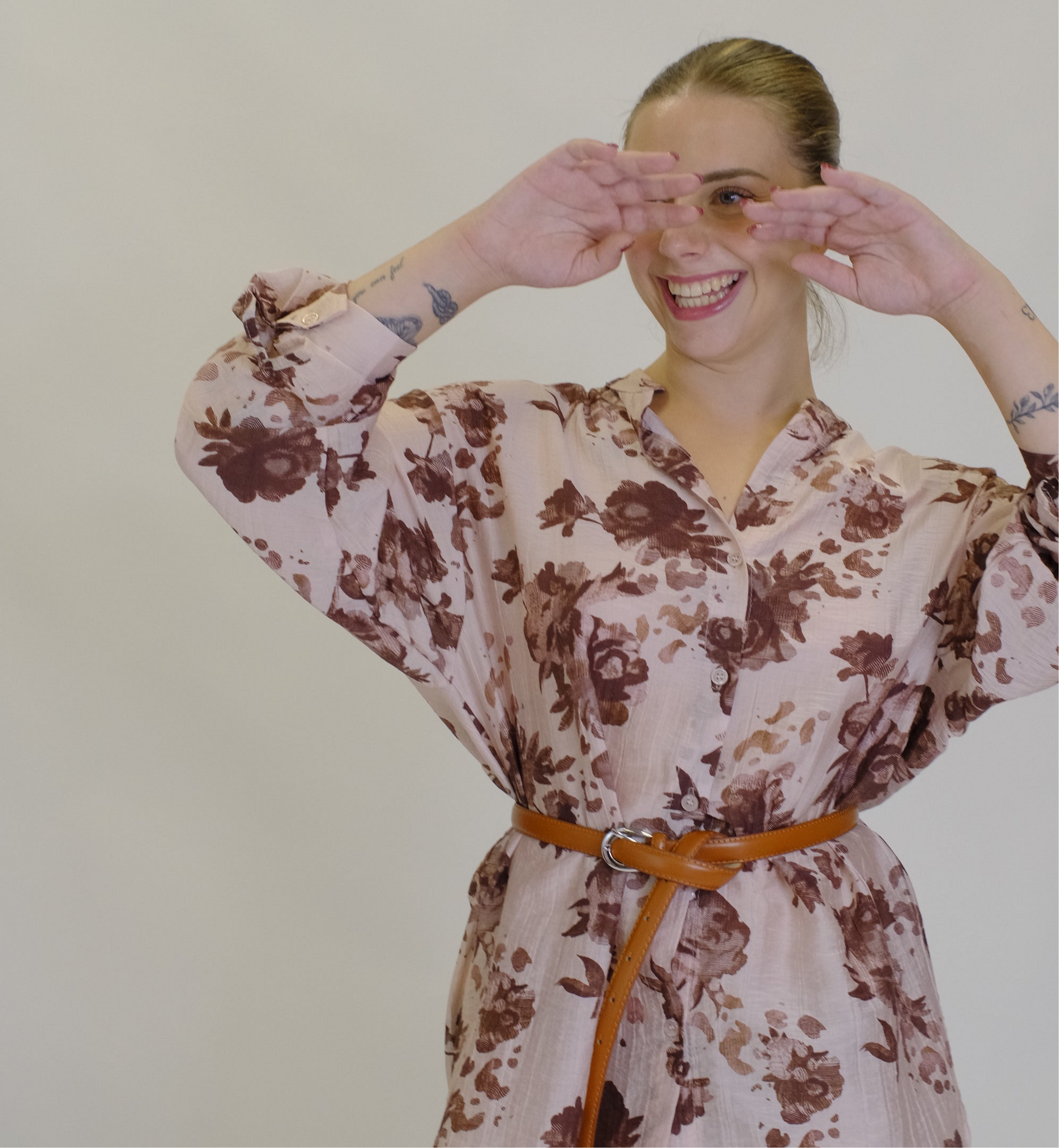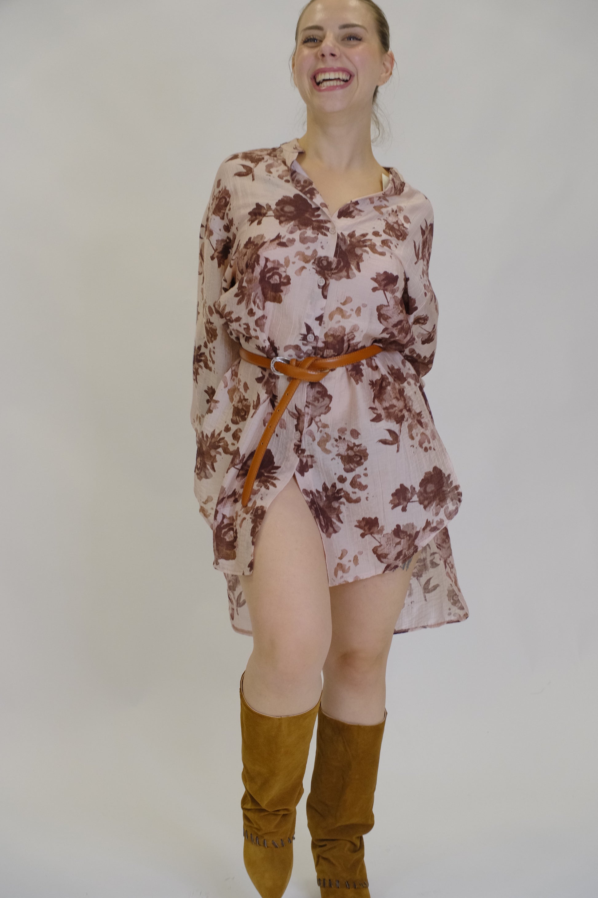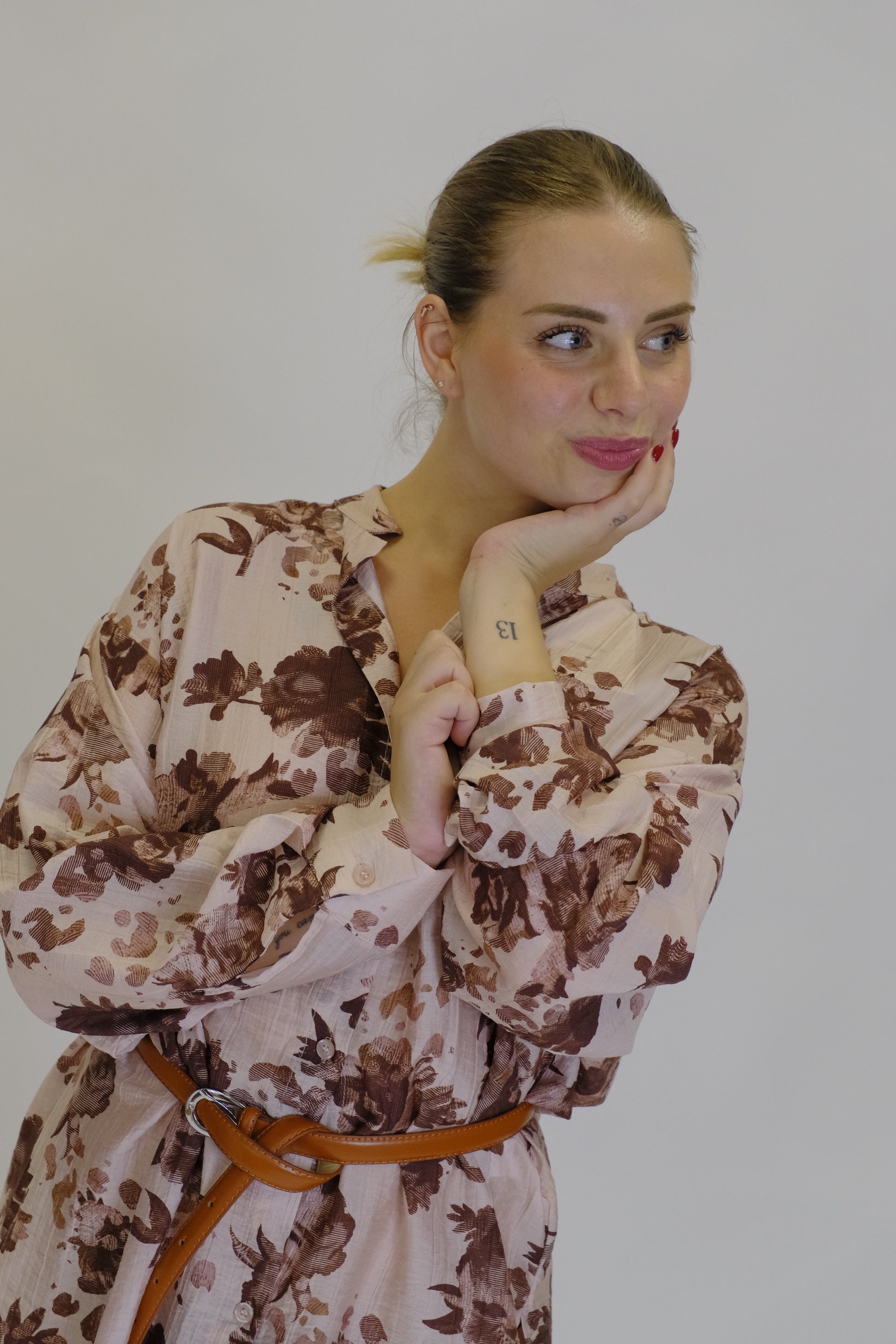 Camicione ampio e fluido, dallo stile artistico e sofisticato. Il tessuto leggero e morbido esalta una splendida fantasia floreale effetto dipinto, proposta in un’unica variante colore su sfondo rosa polvere, delicato e femminile. Il design oversize è completato da un taglio più corto sul davanti e più lungo sul retro, con spacchi laterali che donano movimento e libertà. I polsini sono rifiniti con bottoni tono su tono, per un dettaglio discreto ma curato. (Cintura non inclusa)