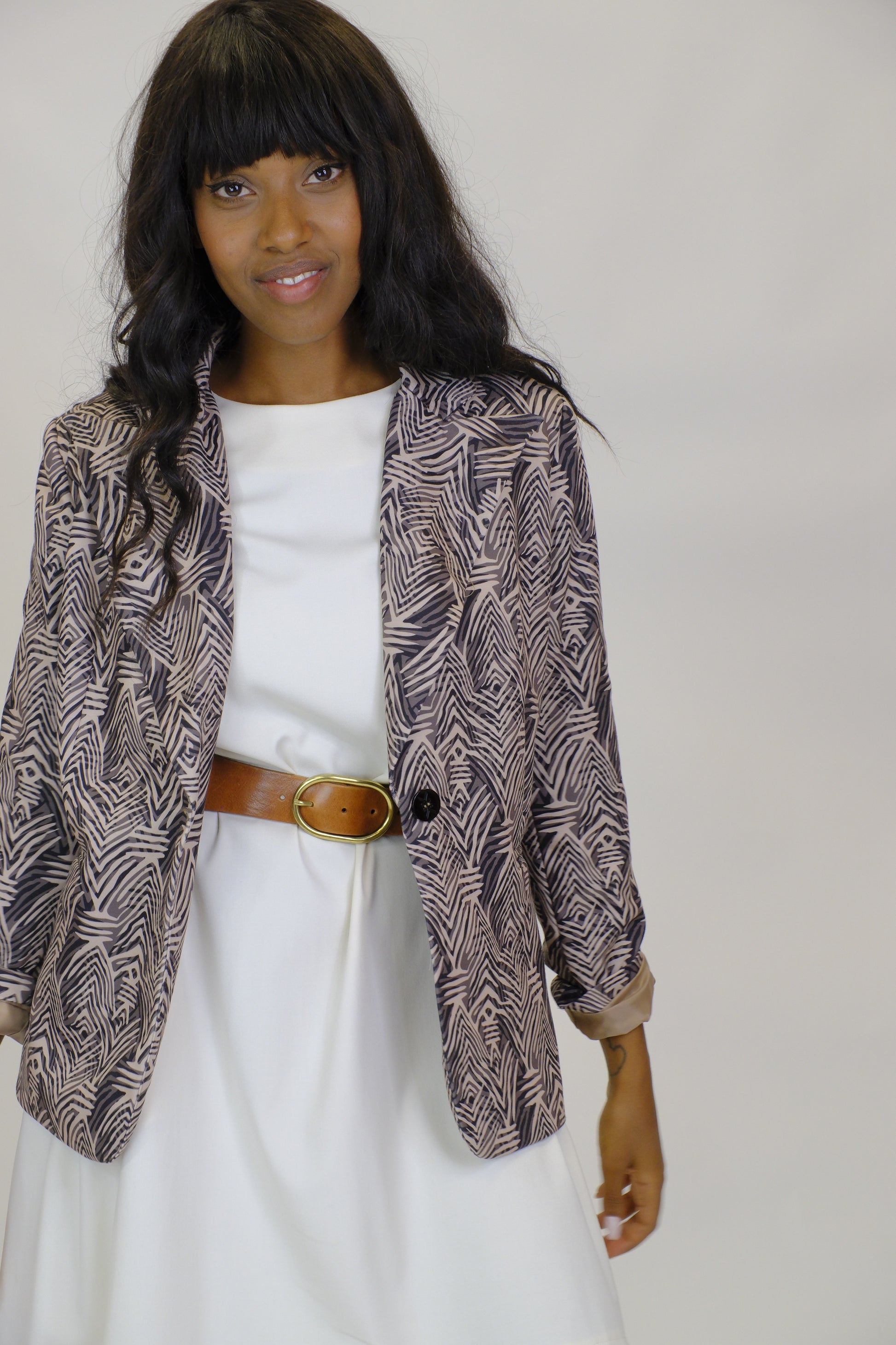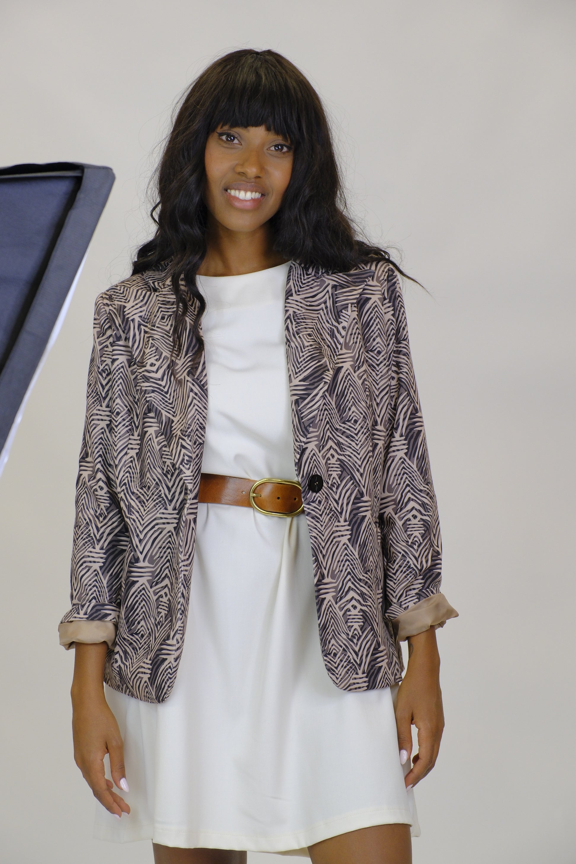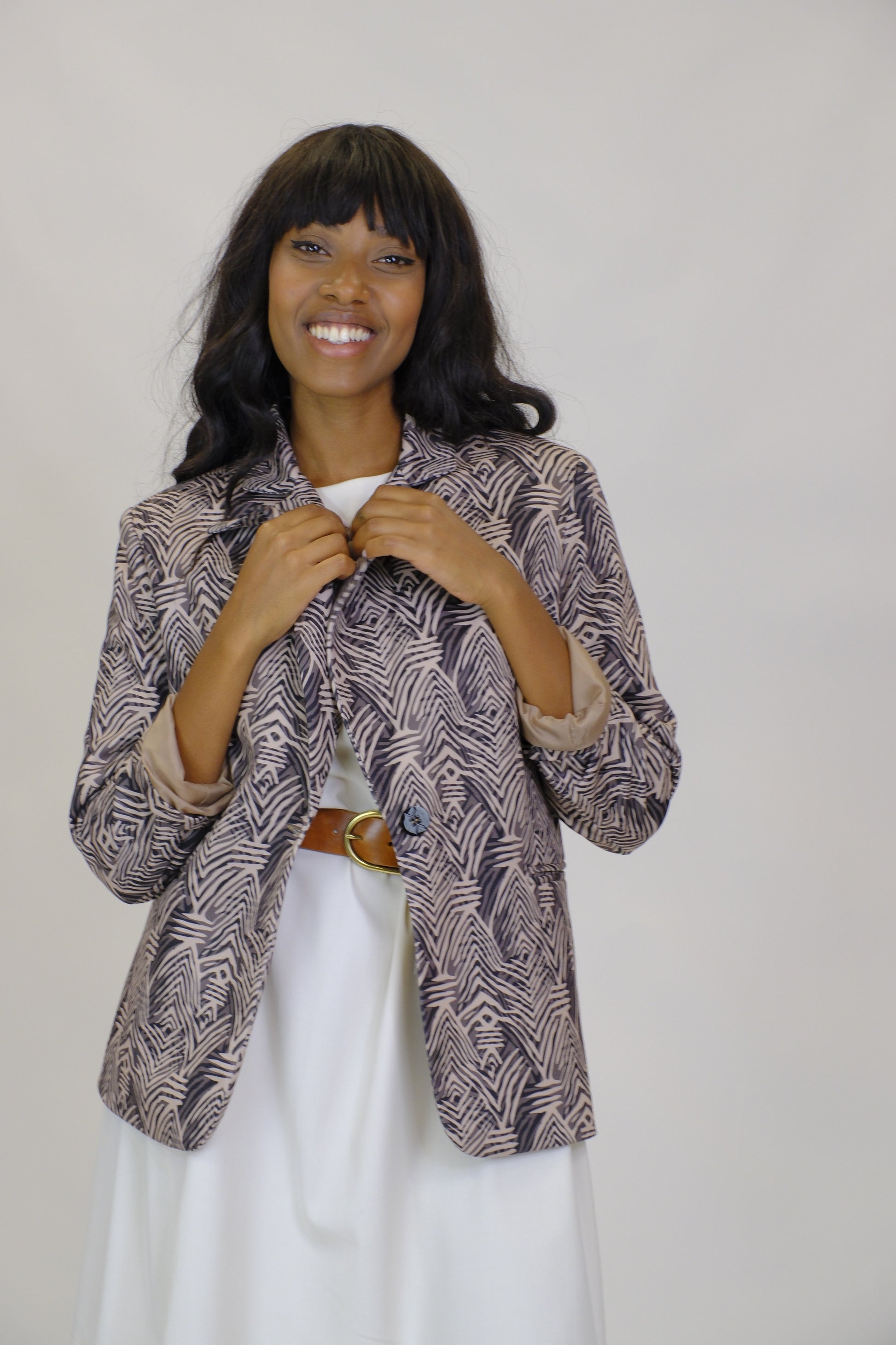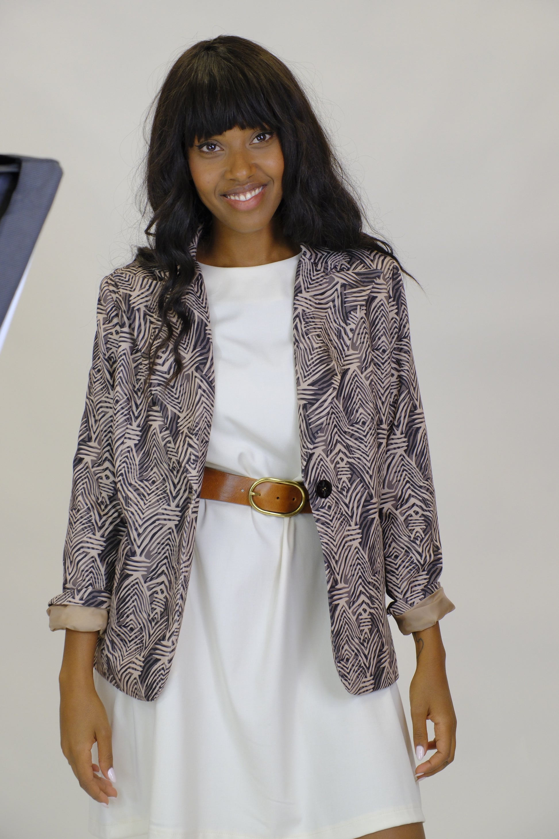 Giacca dal design moderno e ricercato, caratterizzata da una fantasia geometrica nei toni neutri che la rende versatile e sofisticata. Leggera e confortevole grazie alla composizione in poliestere ed elastane, è un capo perfetto per completare look casual-chic o professionali con un tocco di personalità. La linea morbida e la possibilità di indossarla aperta la rendono facilmente abbinabile ad abiti, pantaloni o gonne, adattandosi a diverse occasioni.