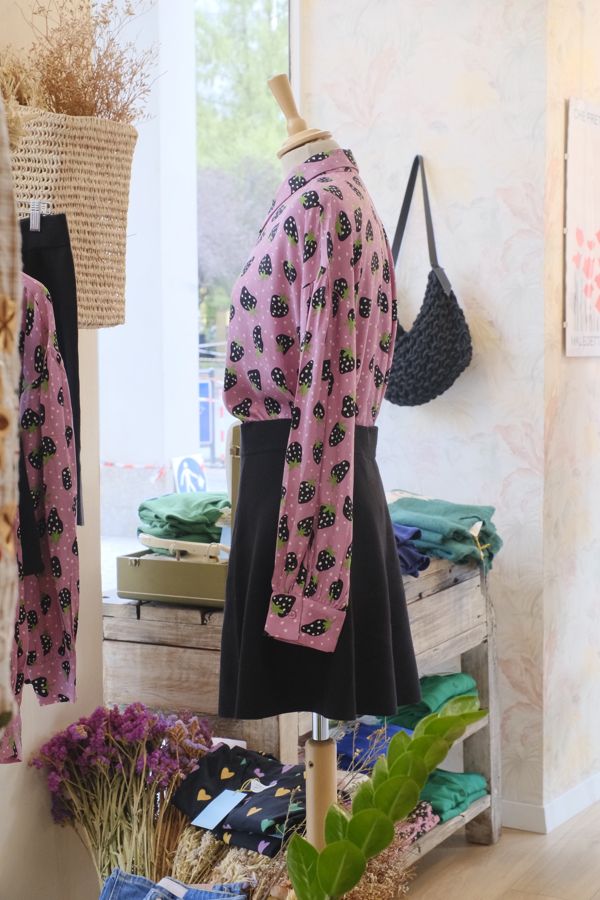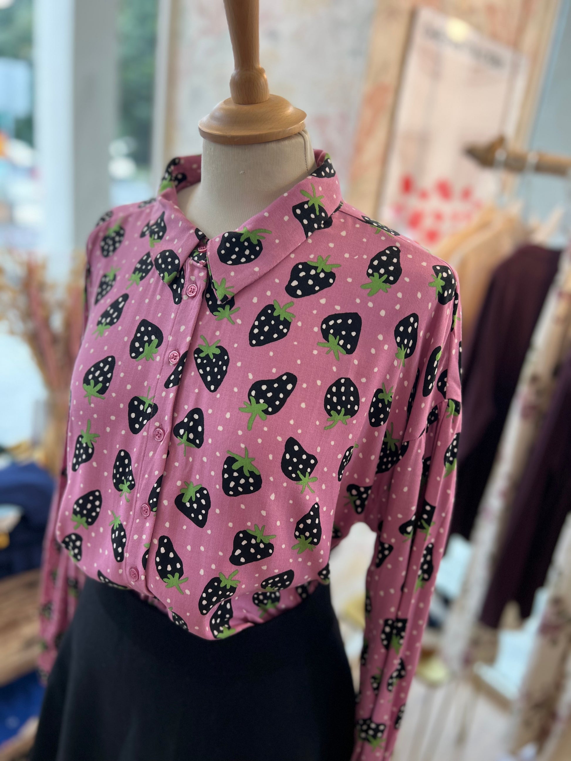 Il fondo rosa pastello è decorato con una fantasia di fragoline nere e verdi che aggiungono un tocco giocoso e originale. Il taglio classico con colletto e bottoni frontali la rende perfetta sia da indossare dentro una gonna o un pantalone, sia portata fuori per un look più rilassato.