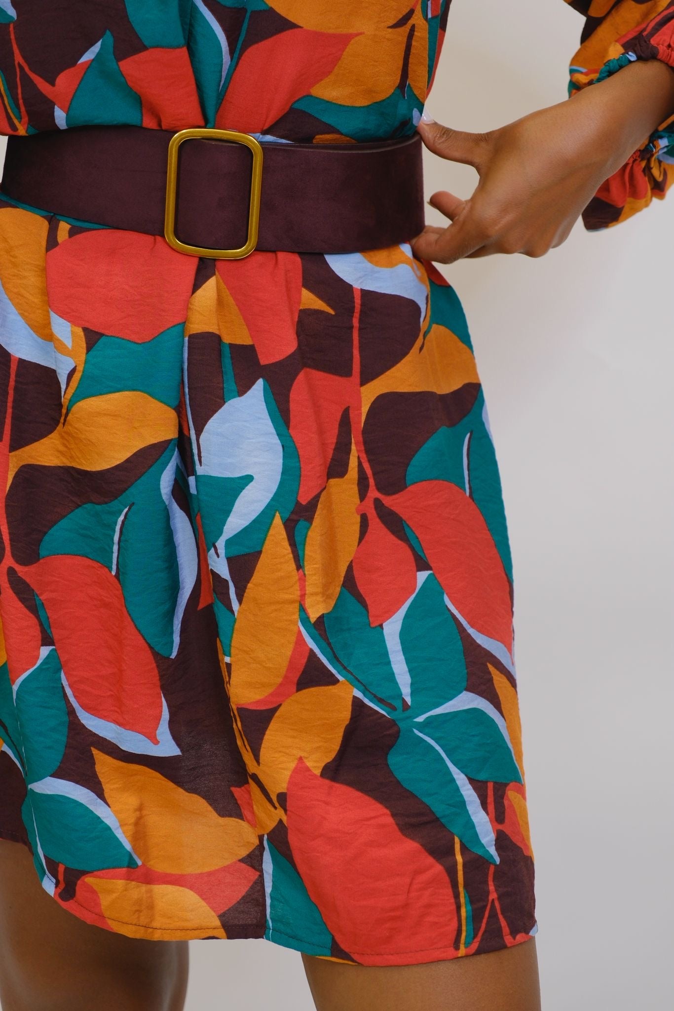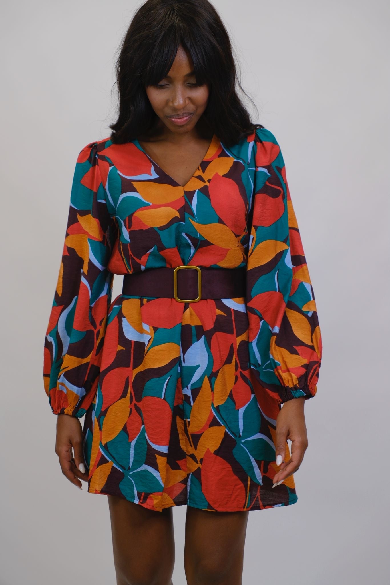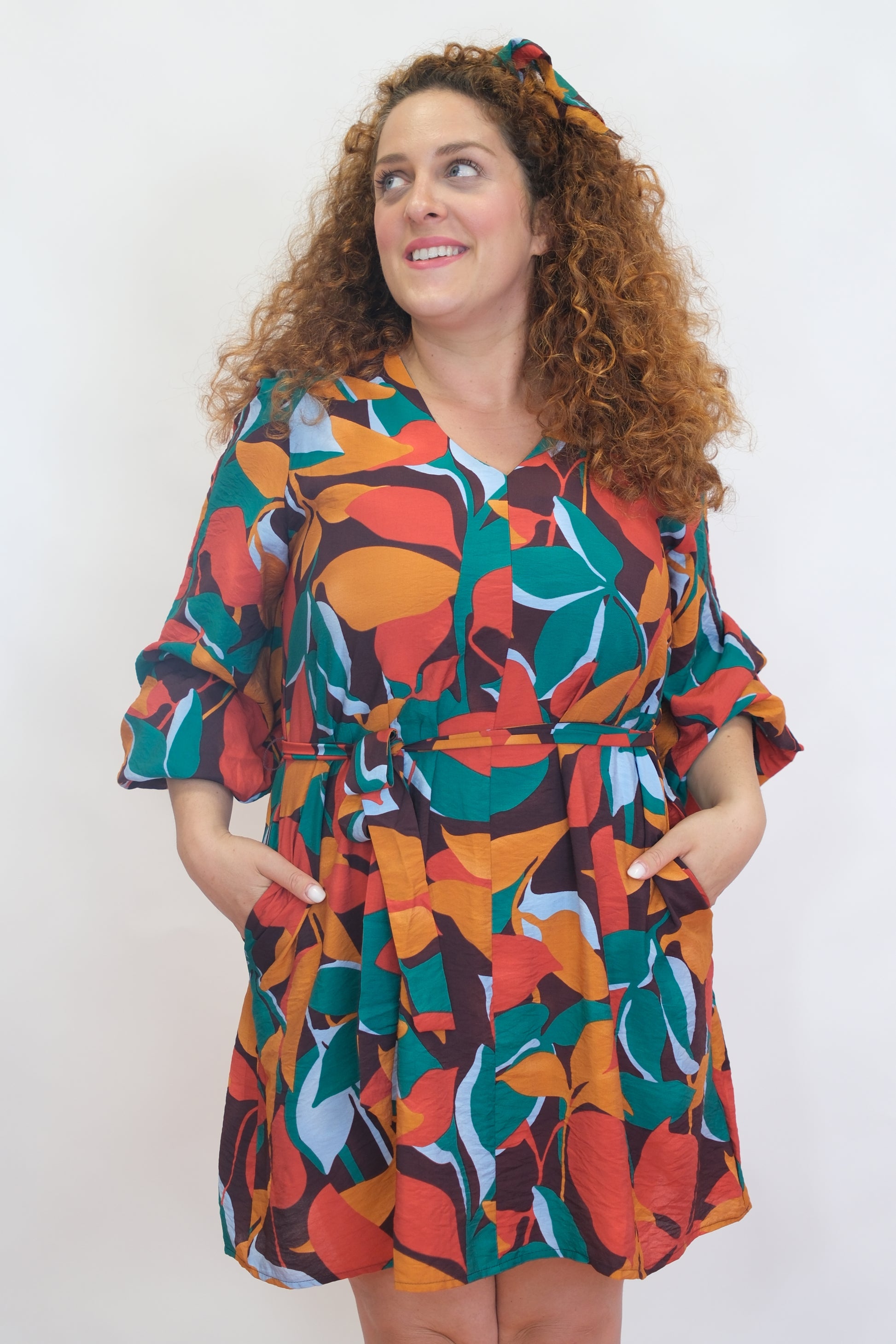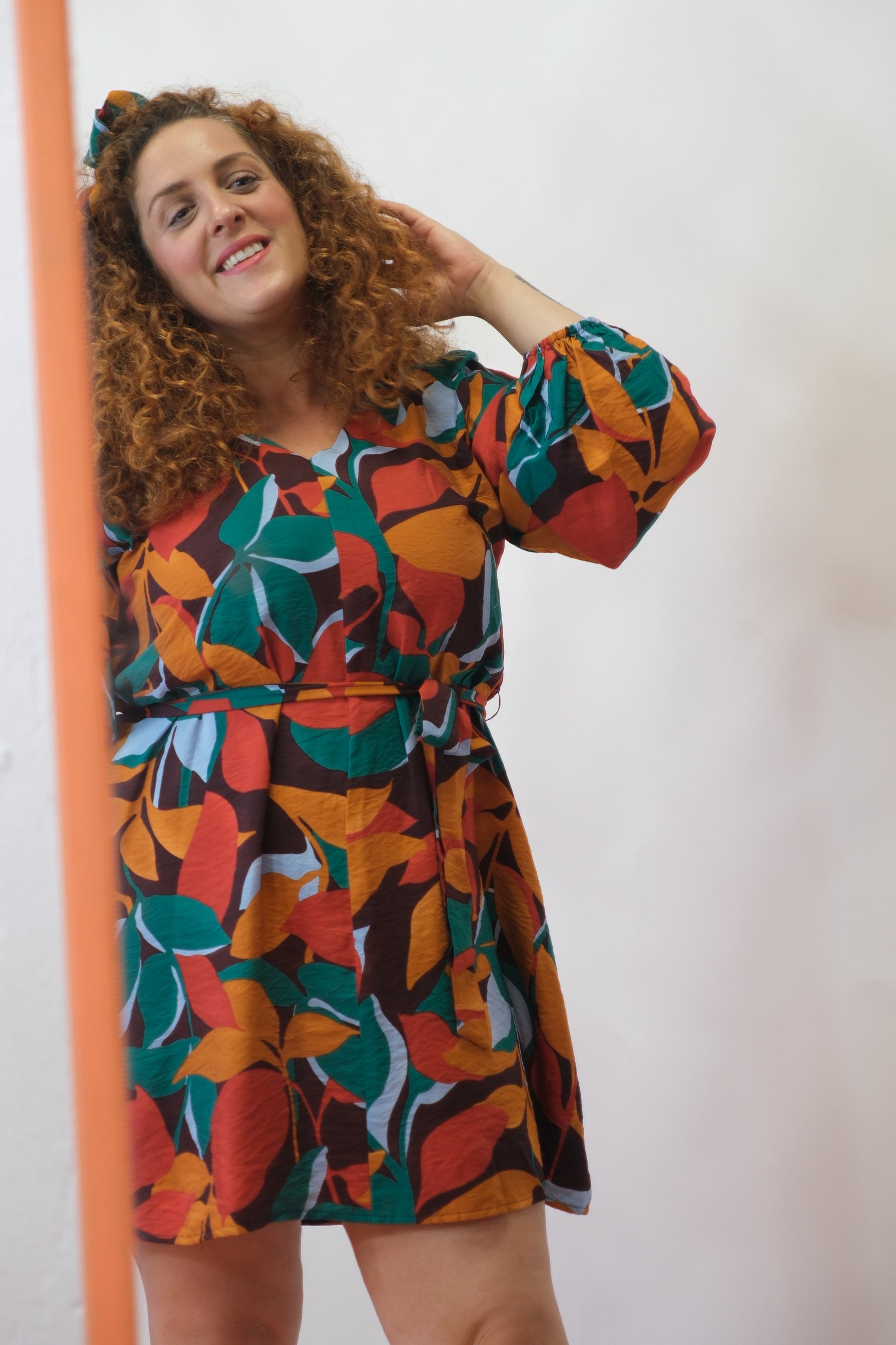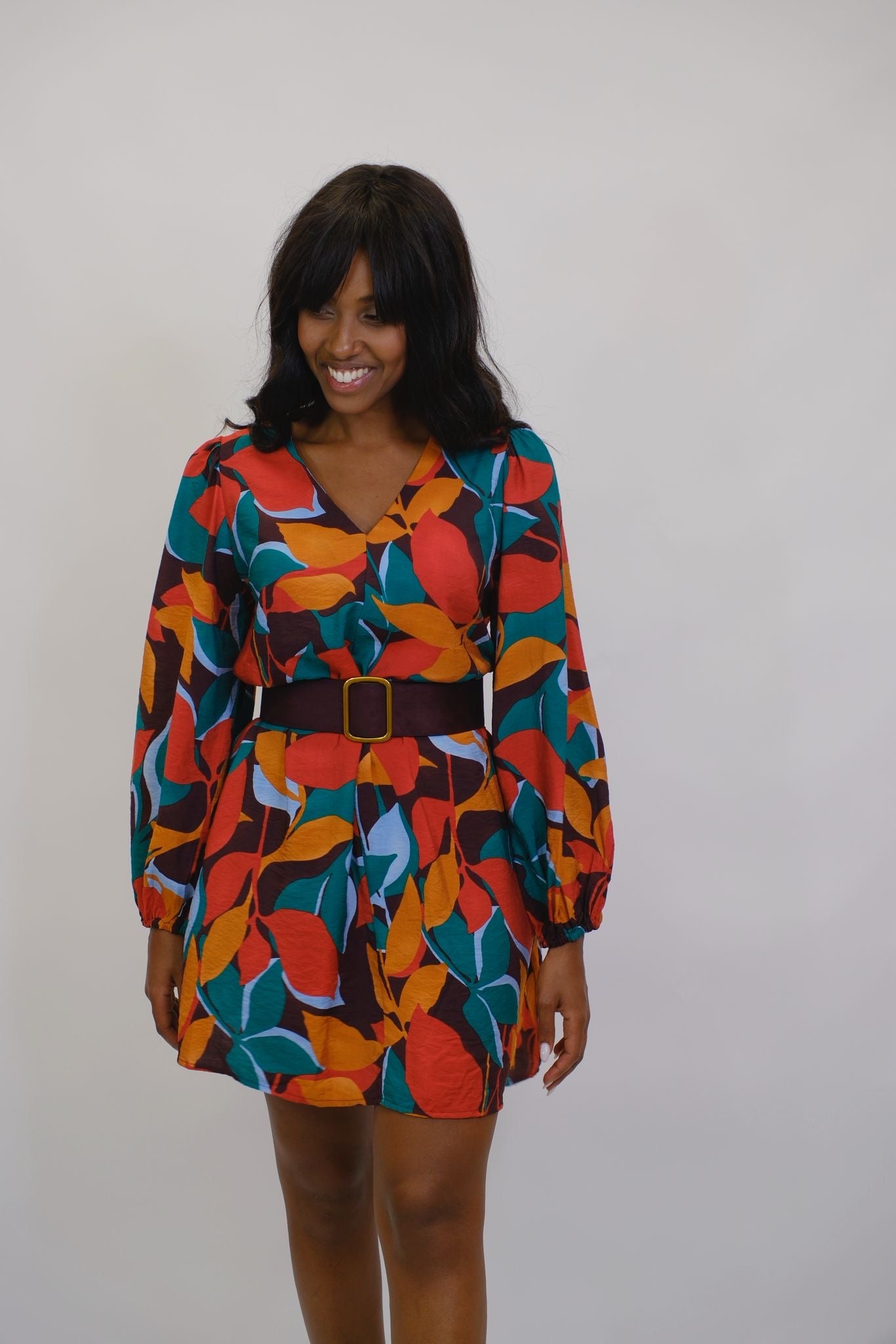 Abito Corto Fantasia Foliage con Cintura – Freschezza ed Eleganza Naturale