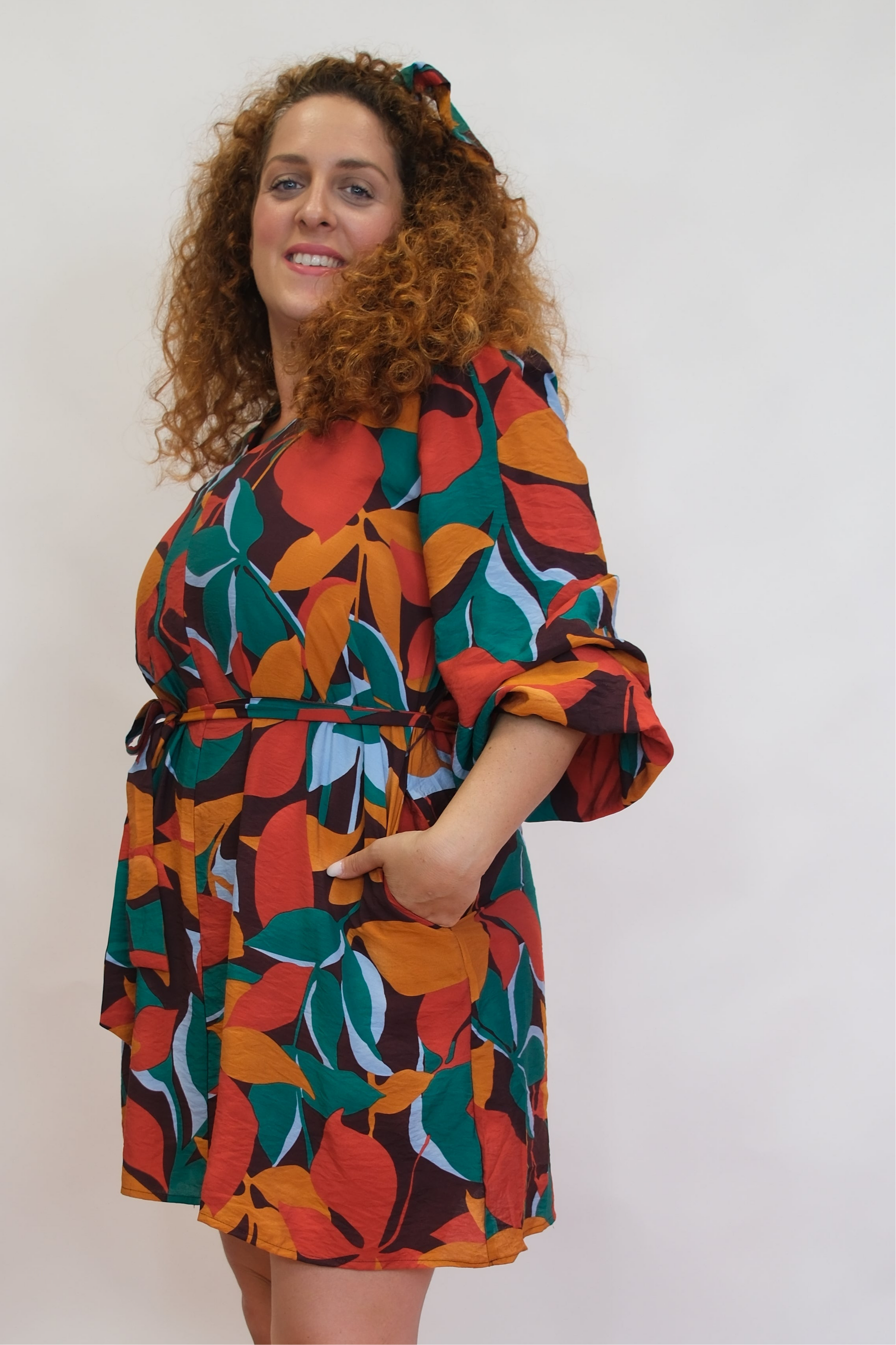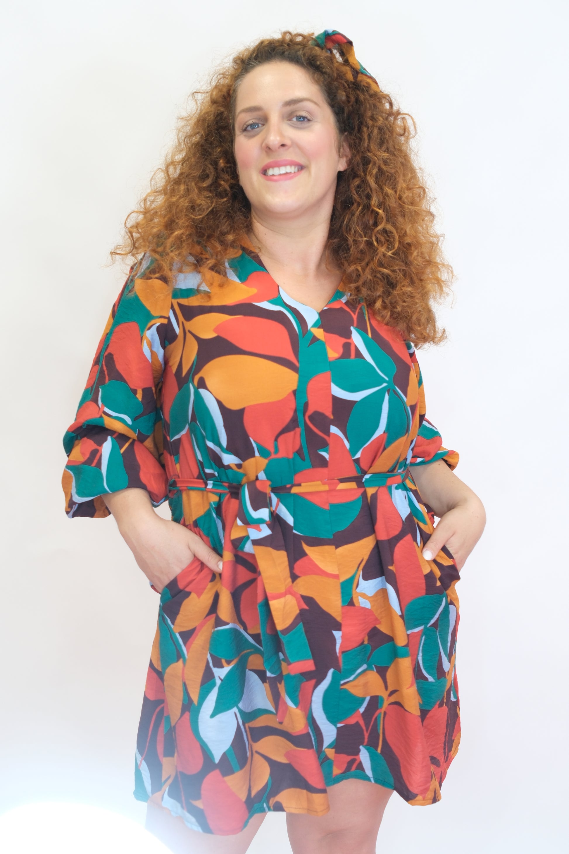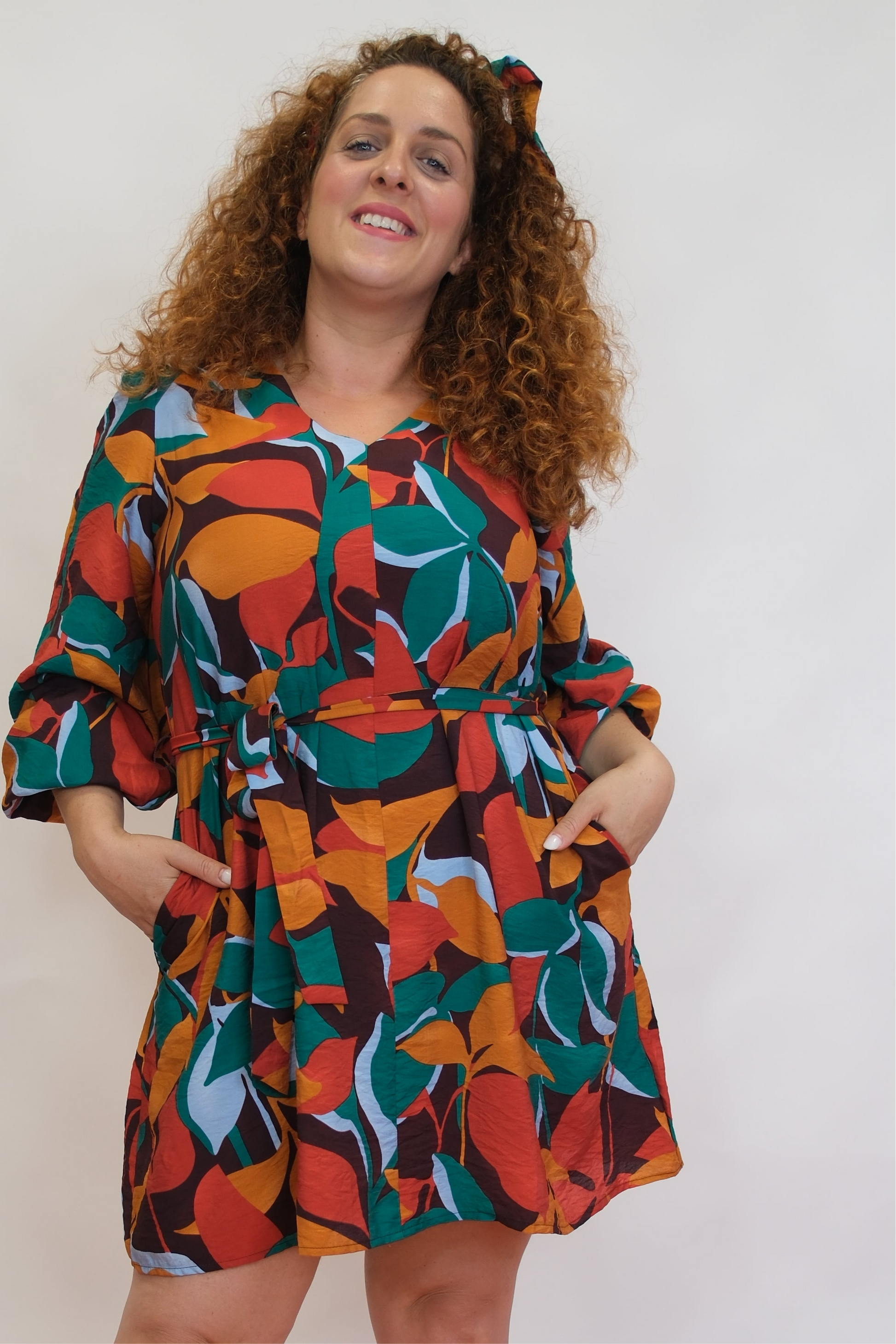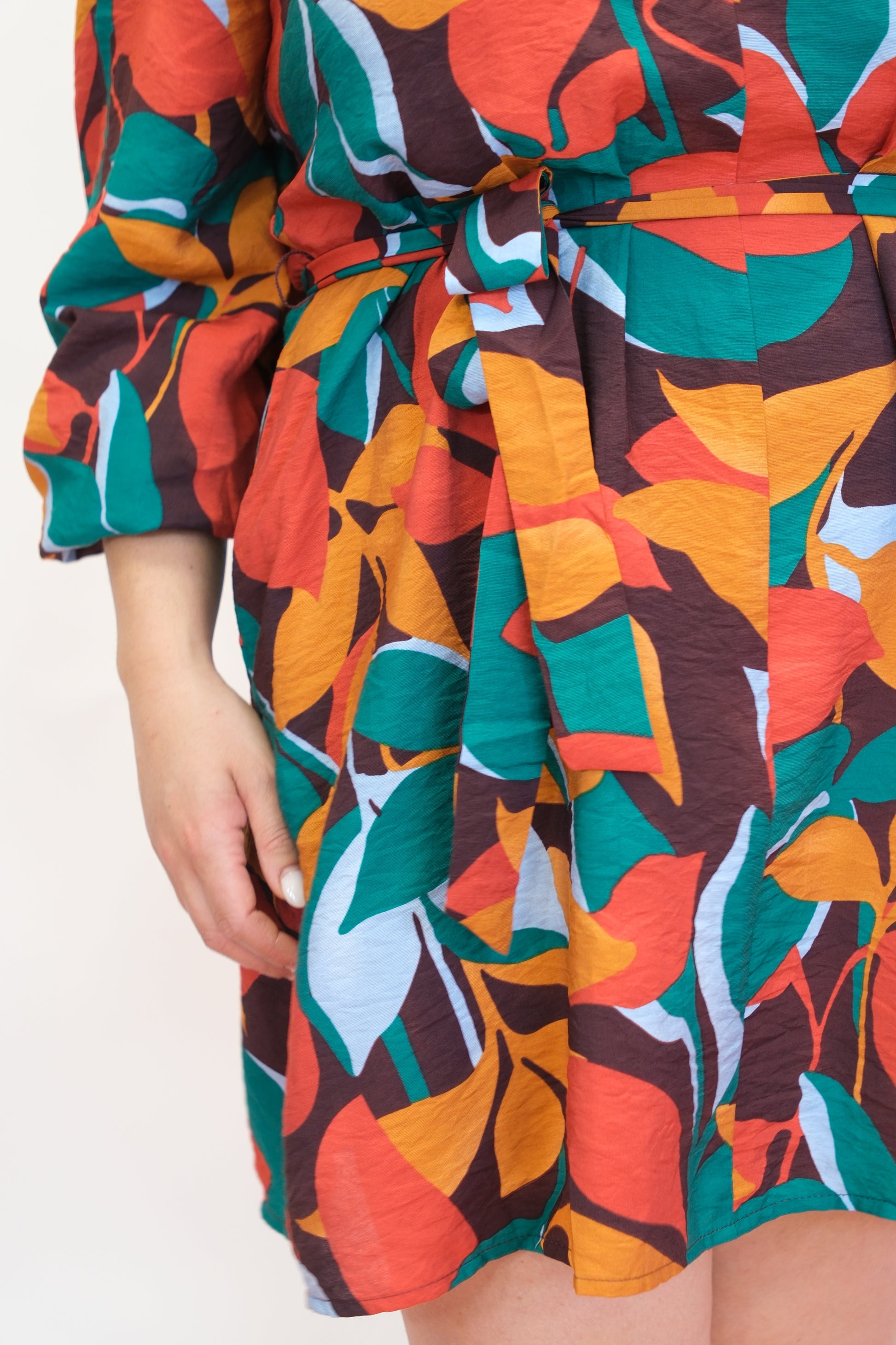 Abito Corto Fantasia Foliage con Cintura – Freschezza ed Eleganza Naturale