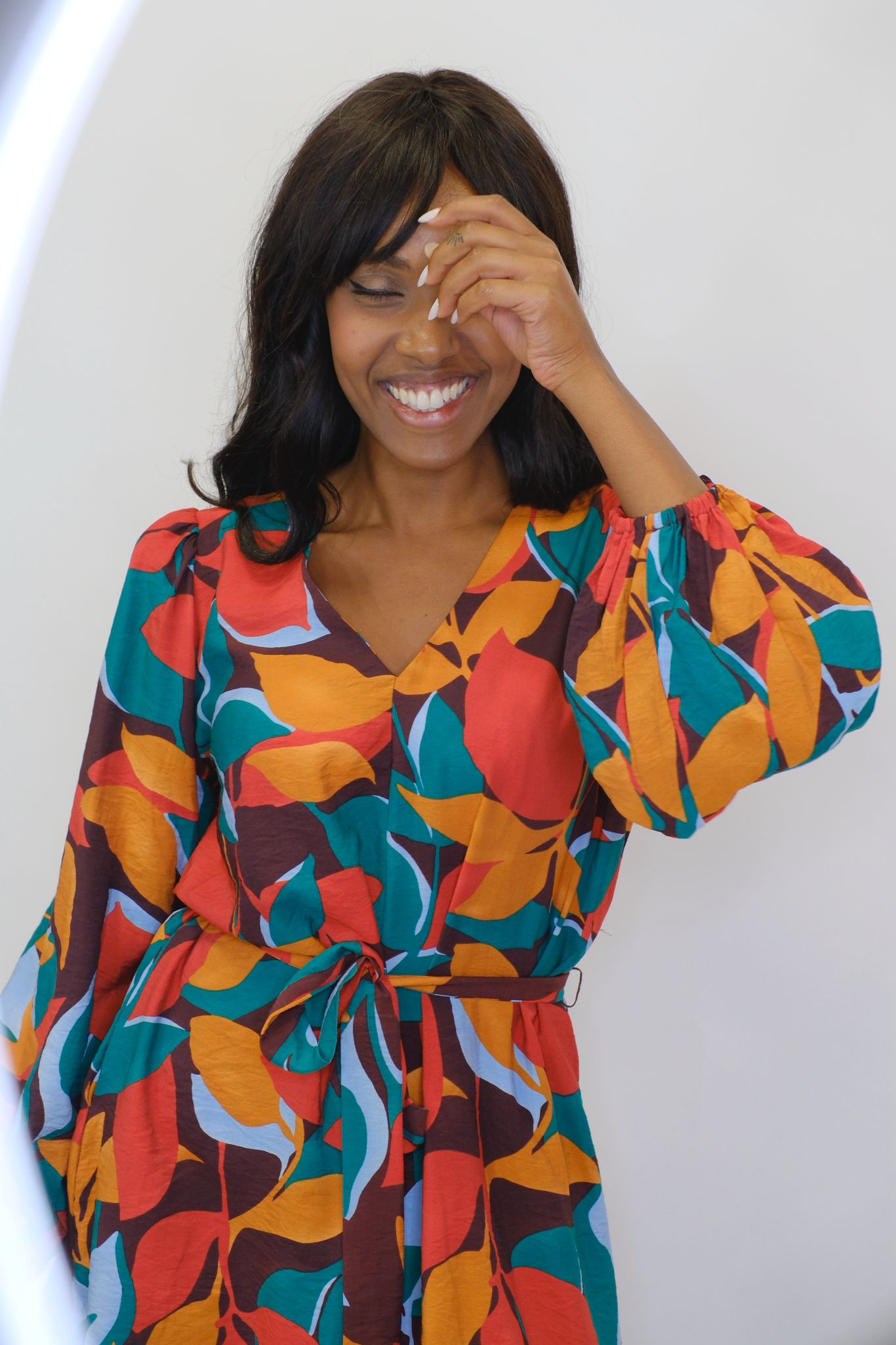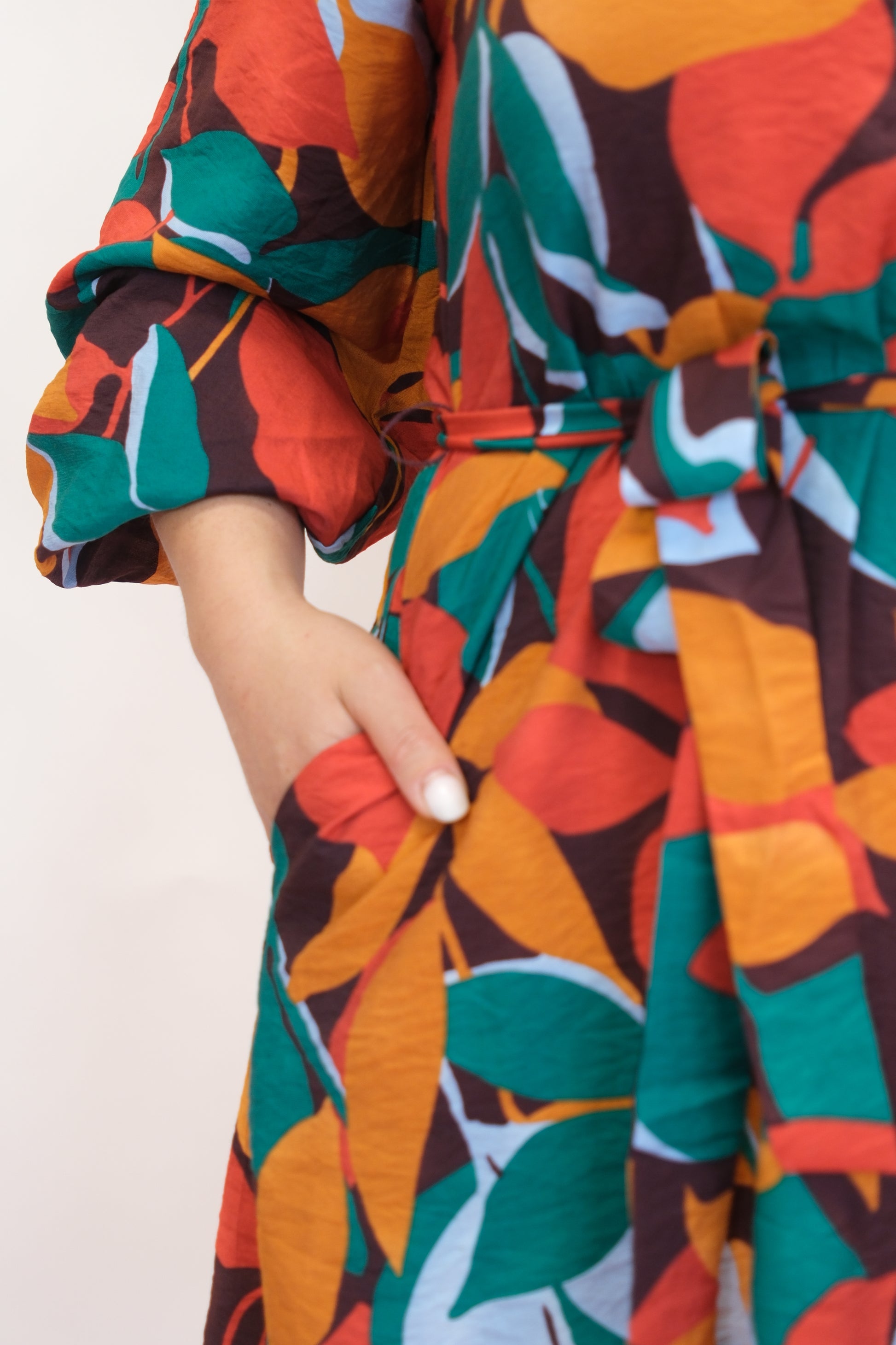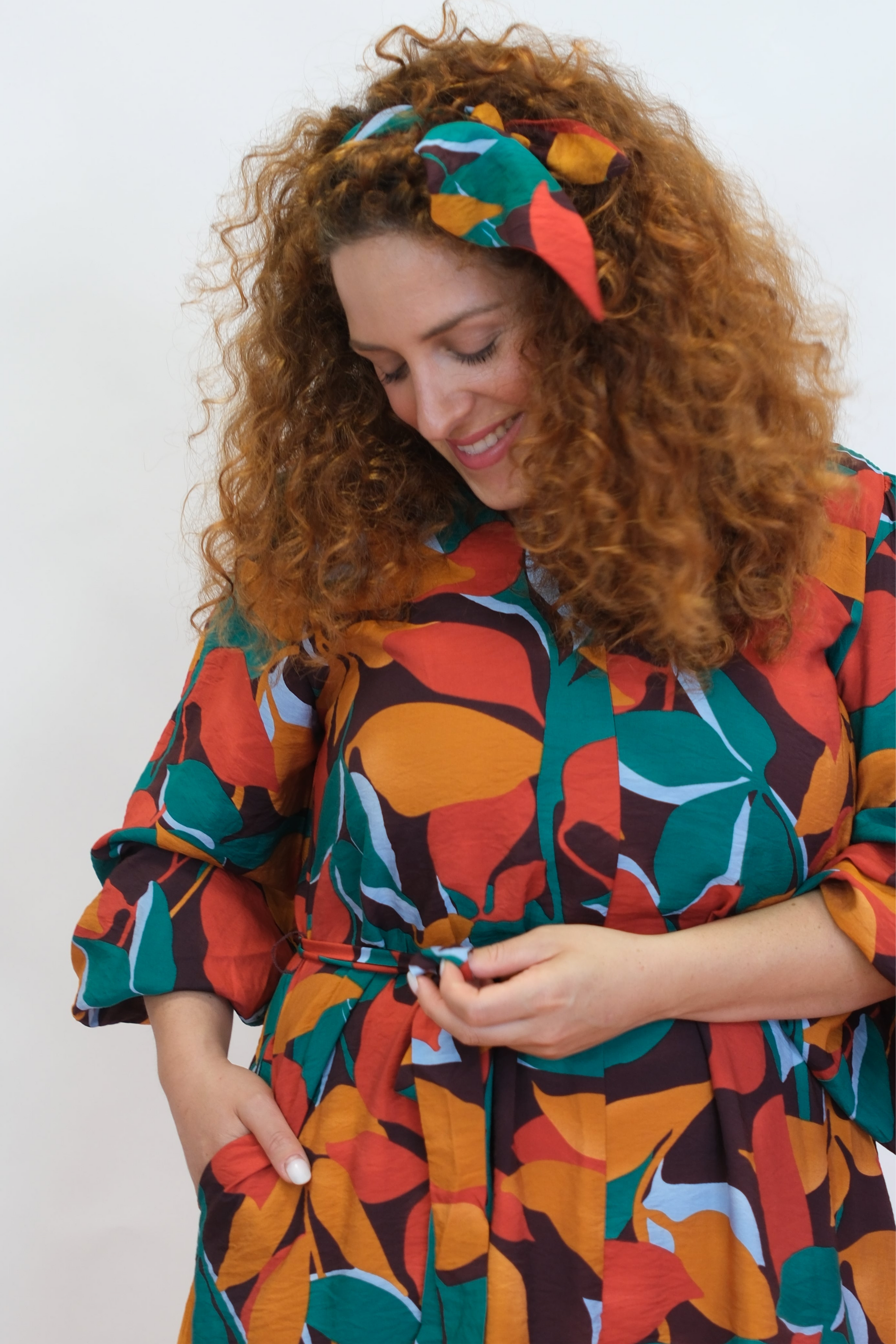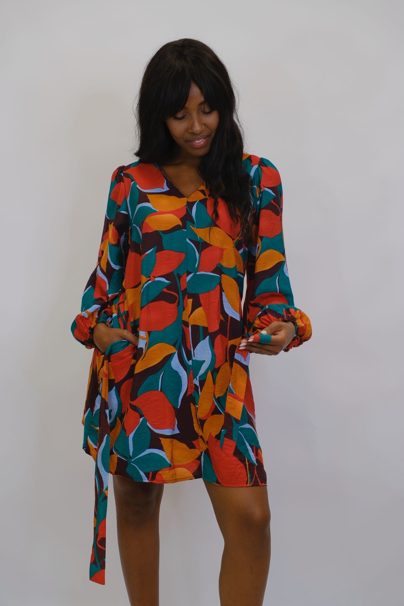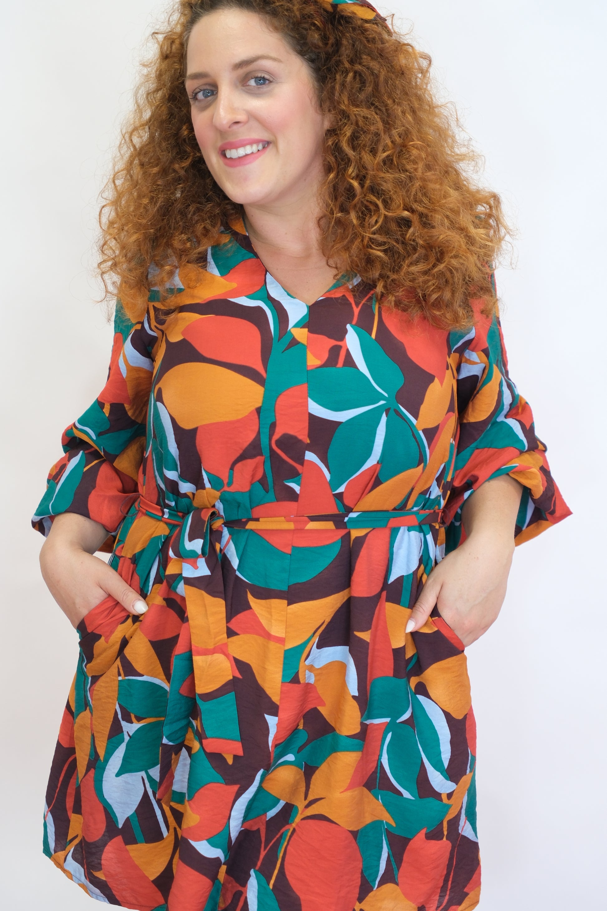 Abito Corto Fantasia Foliage con Cintura – Freschezza ed Eleganza Naturale