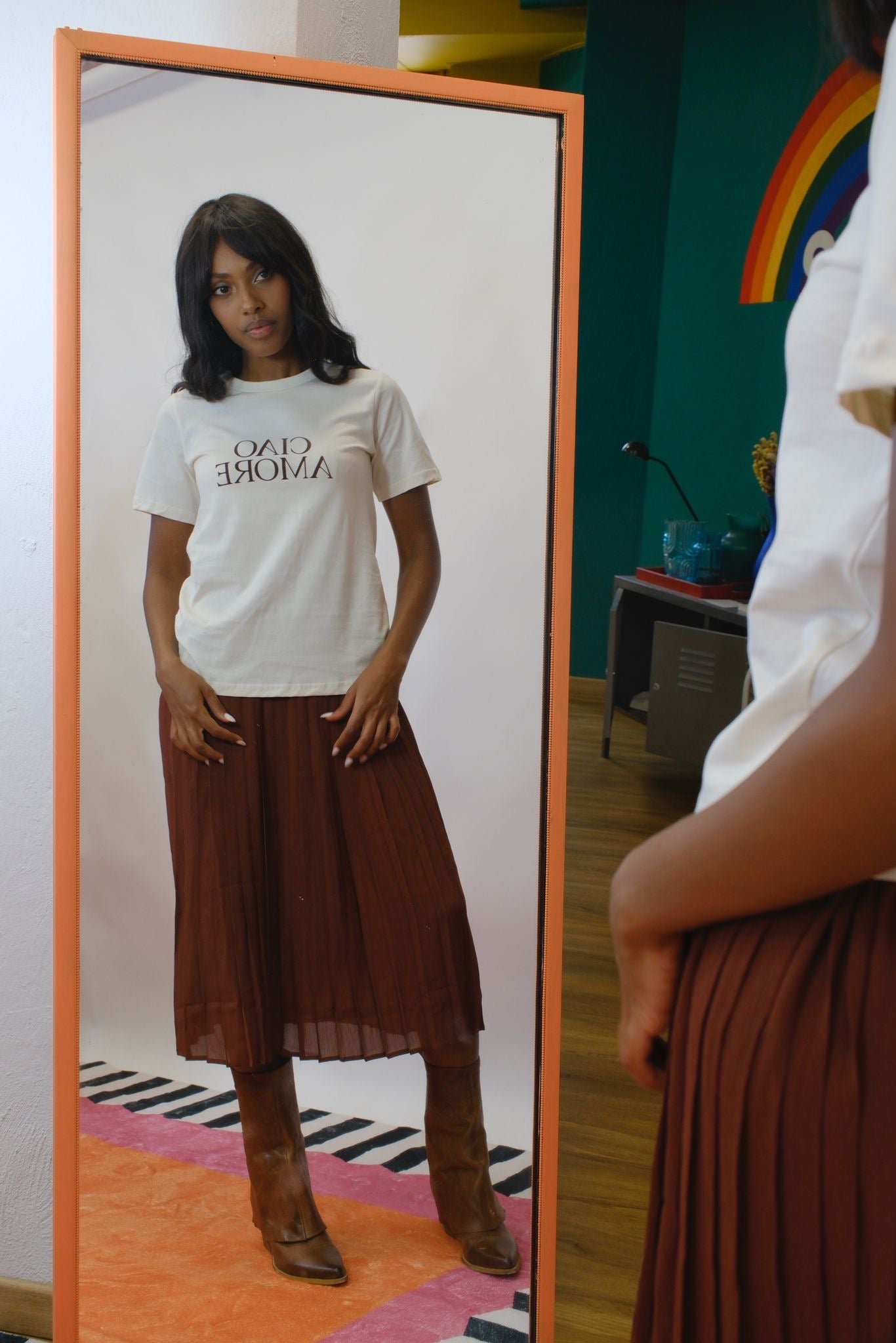 Questa gonna plissé è un capo dallo stile raffinato e senza tempo, ideale per aggiungere un tocco di movimento e femminilità a qualsiasi outfit. Il tessuto leggero in 100% poliestere è arricchito da una fodera interna che garantisce comfort e perfetta vestibilità. Un modello versatile, perfetto sia per look quotidiani che per occasioni speciali.