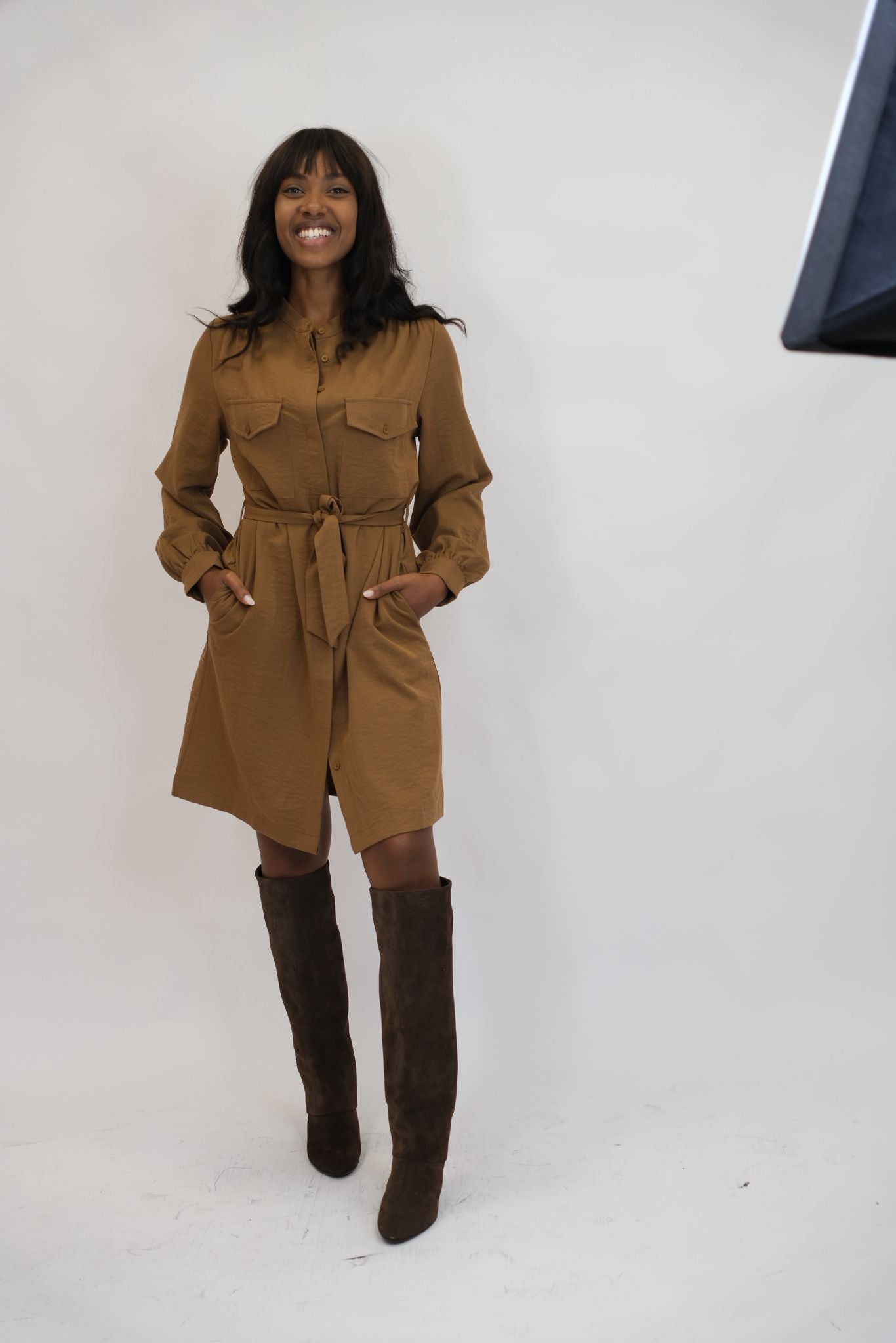Un abito chemisier dallo stile senza tempo, pensato per unire eleganza e praticità. La cintura realizzata nello stesso tessuto permette di valorizzare il punto vita, donando armonia alla silhouette. La linea scorrevole e la composizione mista assicurano comfort e vestibilità, rendendolo un capo perfetto per il giorno e per le occasioni più raffinate.