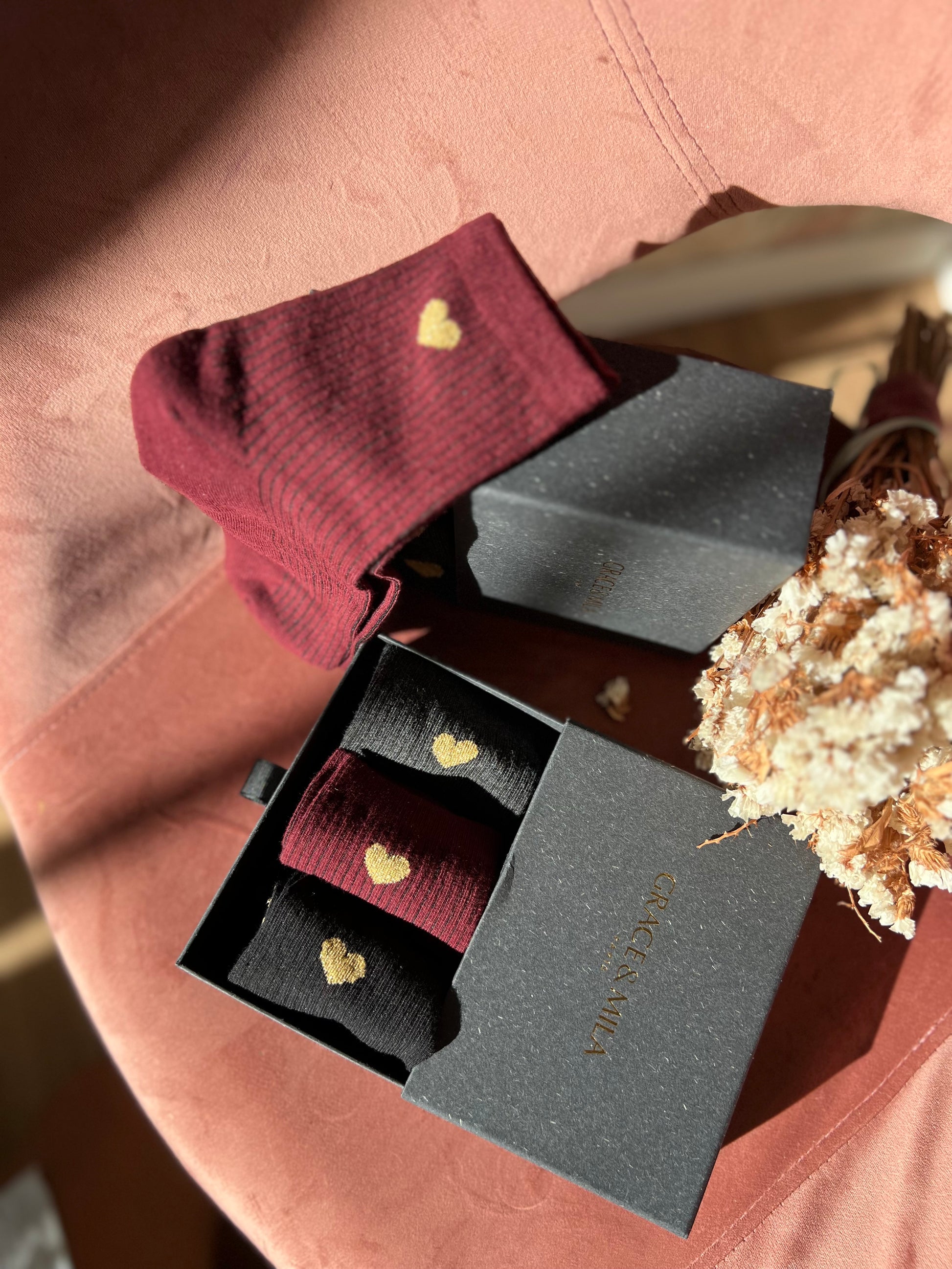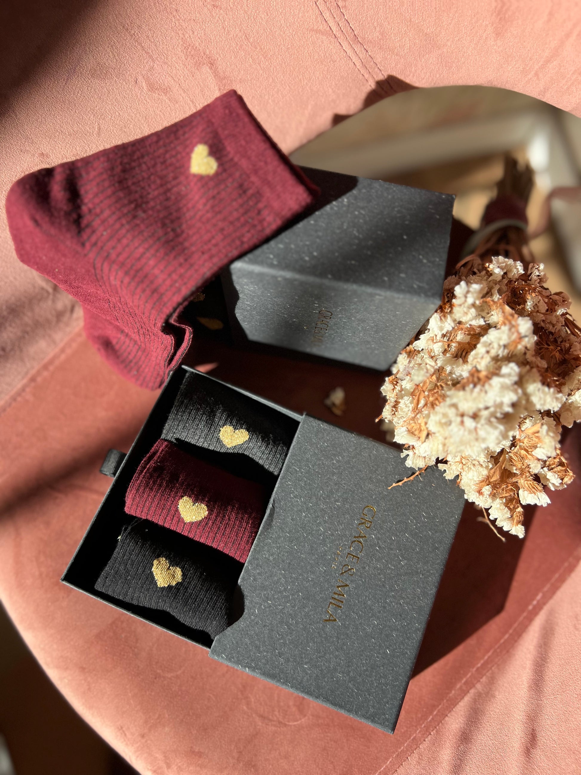 Rendi unico il tuo stile con questo elegante set di 3 paia di calzini Grace & Mila. La confezione include tre calzini nei colori nero e bordeaux, impreziositi da un delicato ricamo a cuore dorato che dona un tocco romantico e raffinato.