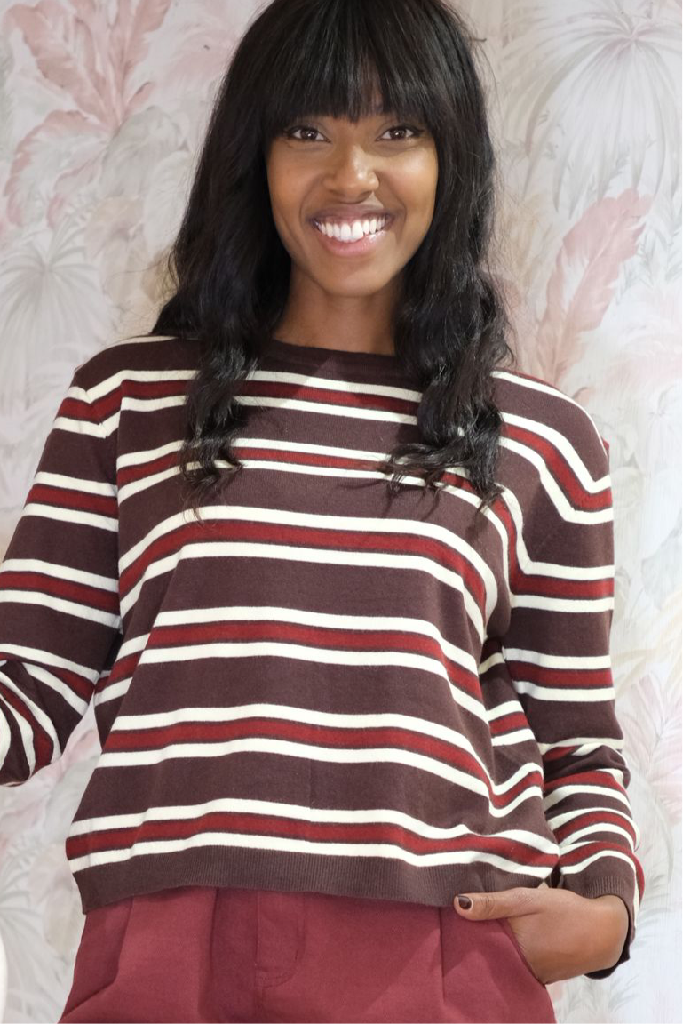 Aggiungi un tocco casual e raffinato al tuo guardaroba con questo maglioncino a righe nei toni del caffè, bianco e borgogna. Il design con righe orizzontali lo rende un capo intramontabile, facile da abbinare sia con jeans e pantaloni per un look quotidiano, sia con gonne o shorts per outfit più femminili.