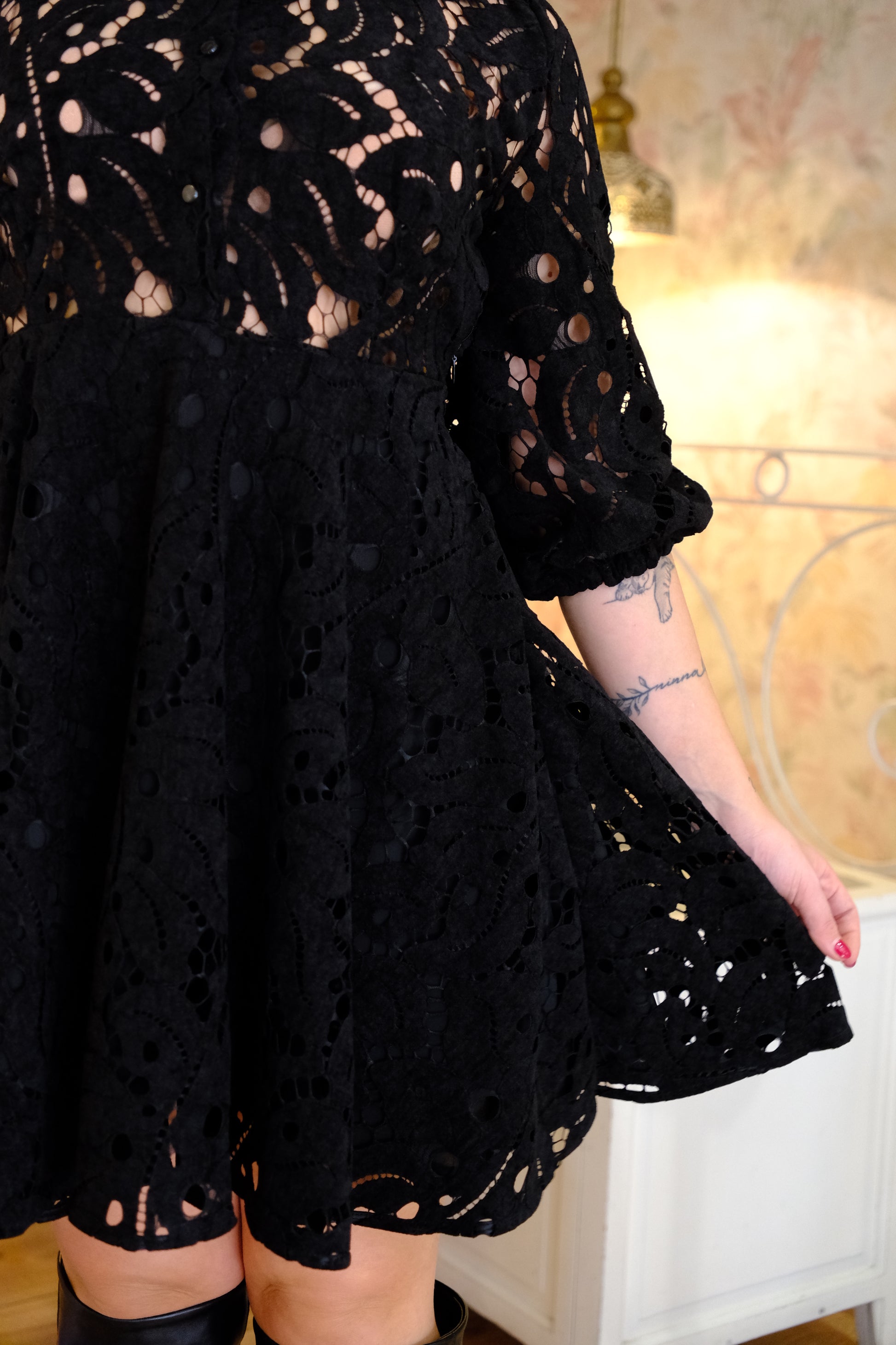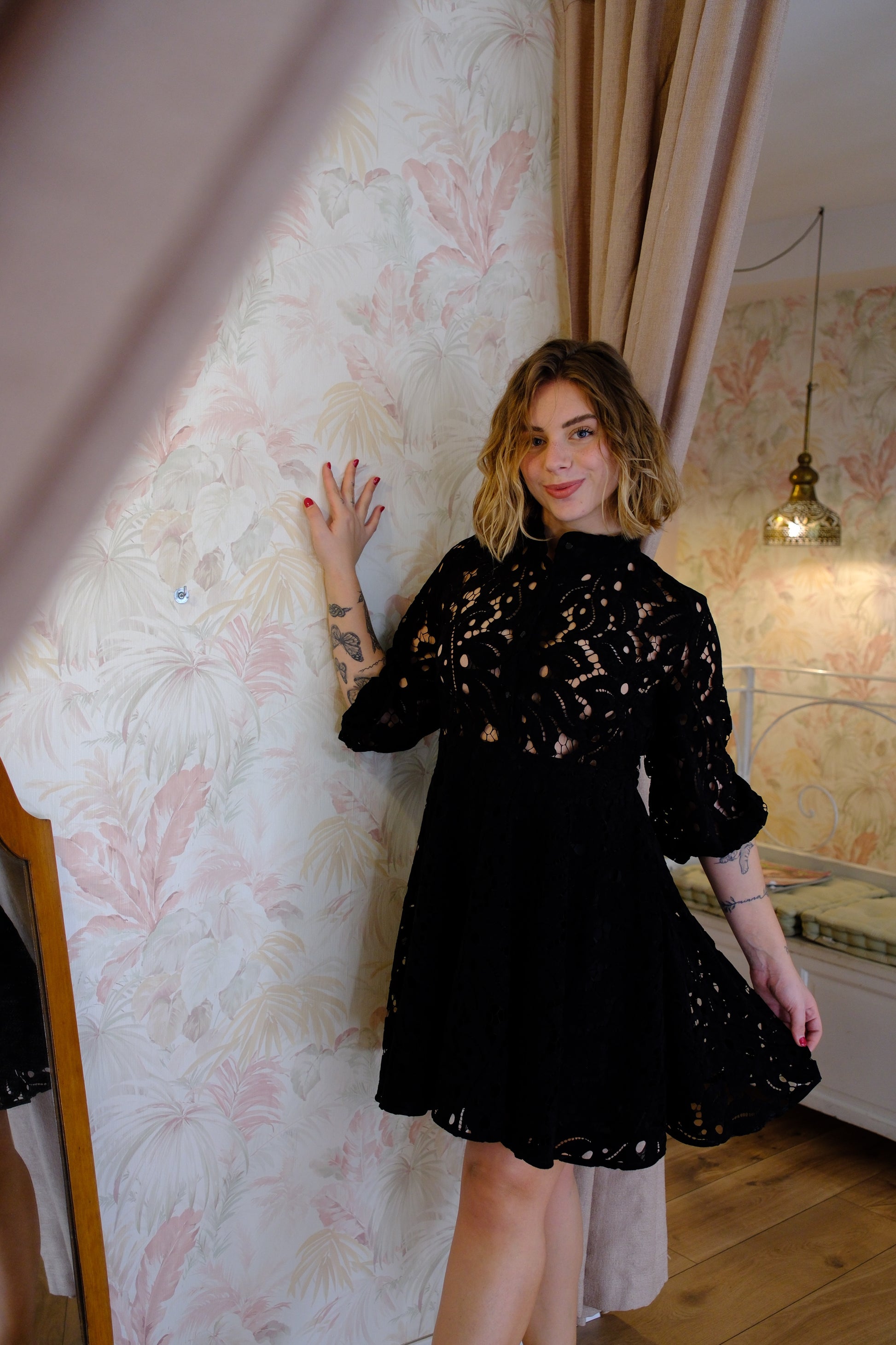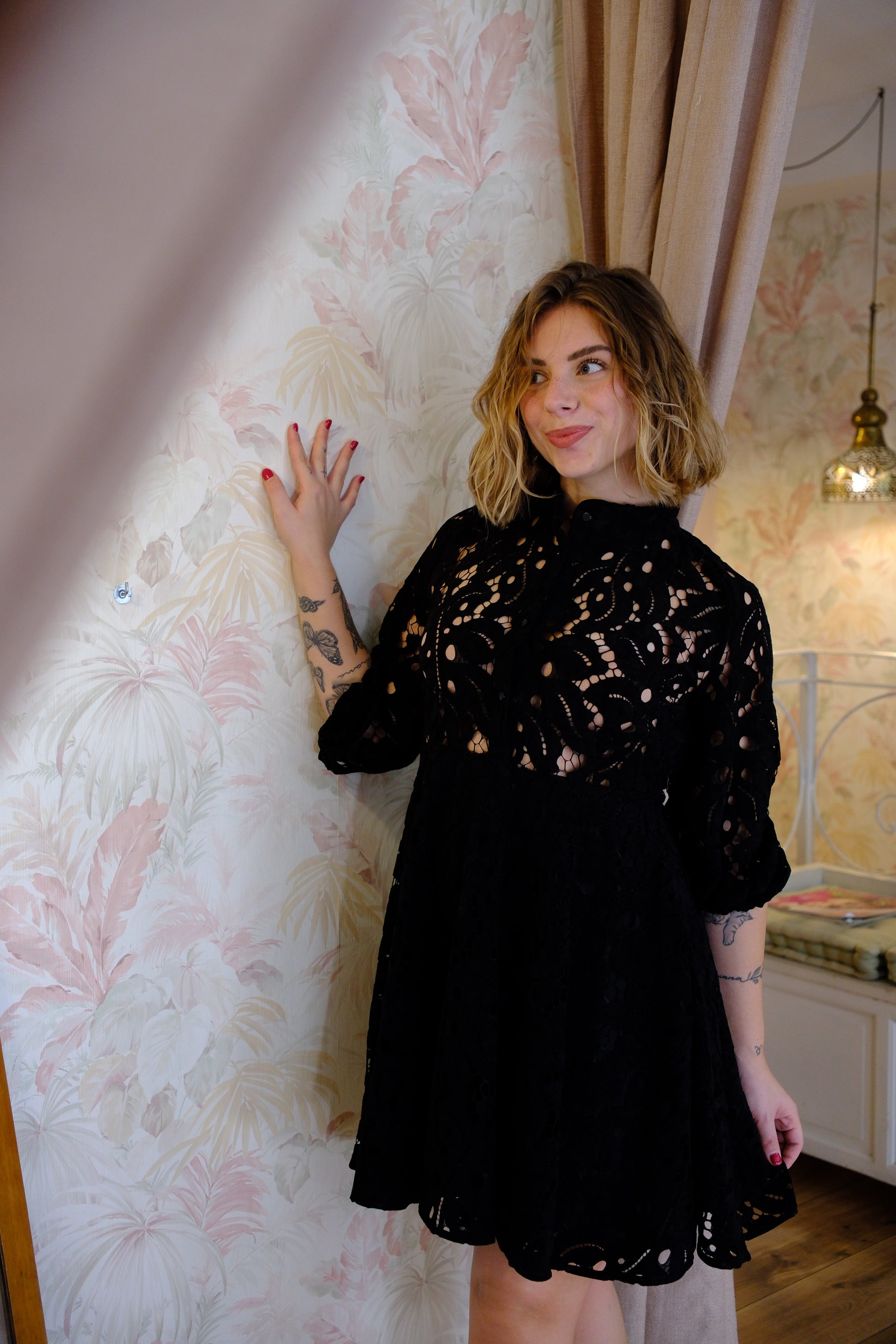Abito corto dallo stile romantico e fresco, realizzato in stile sangallo che dona un effetto raffinato e femminile. La fodera interna dalla vita in giù assicura comfort e una perfetta vestibilità, mentre il design leggero e arioso lo rende ideale per la stagione estiva o per occasioni casual chic.