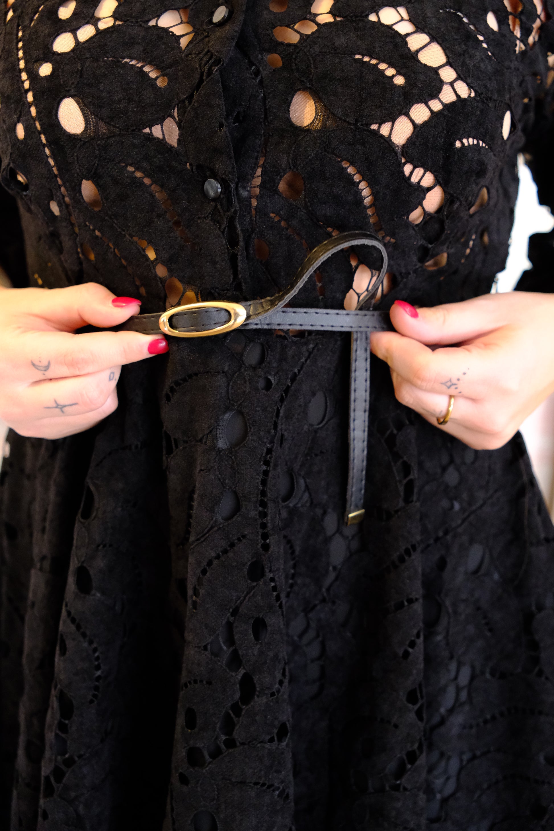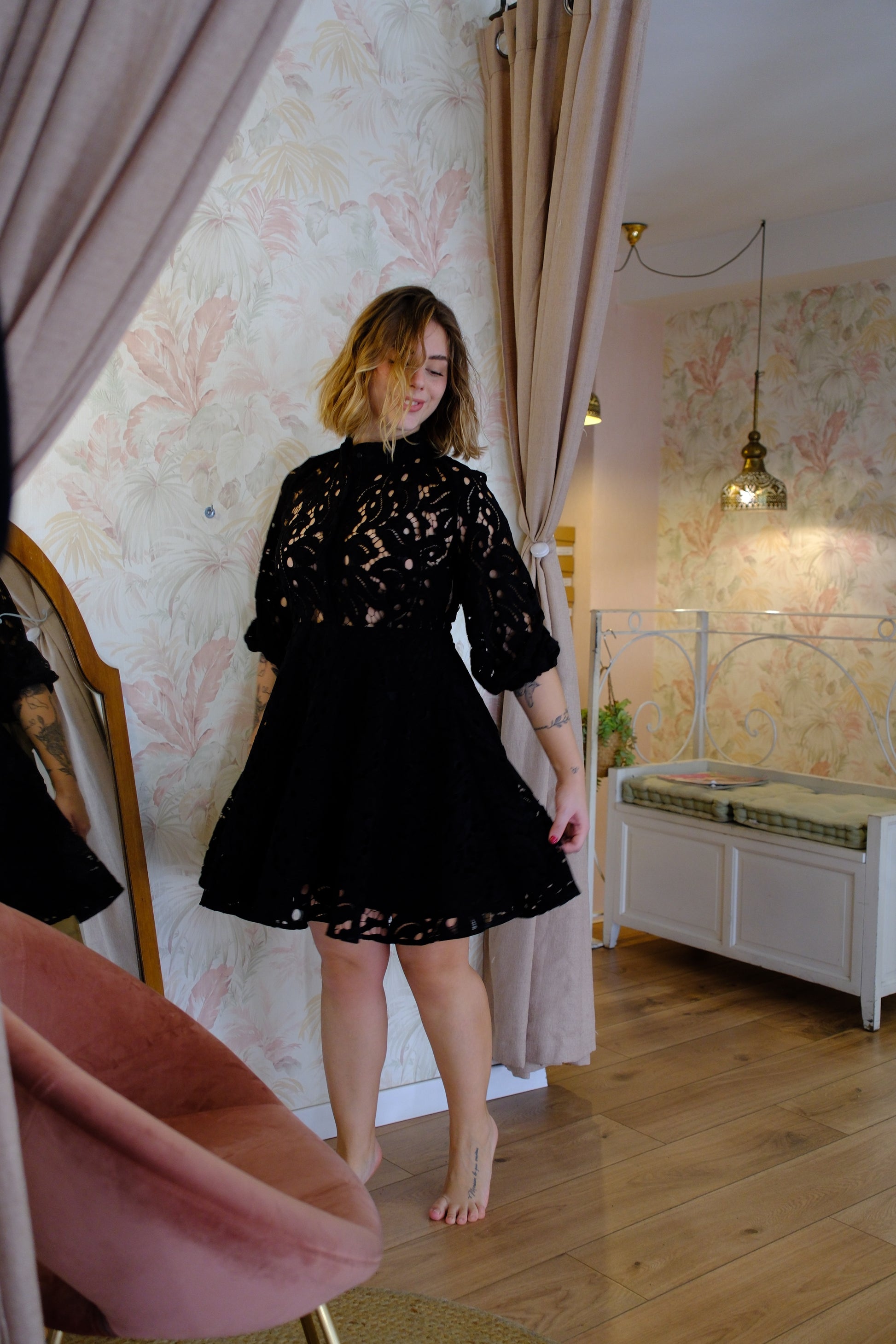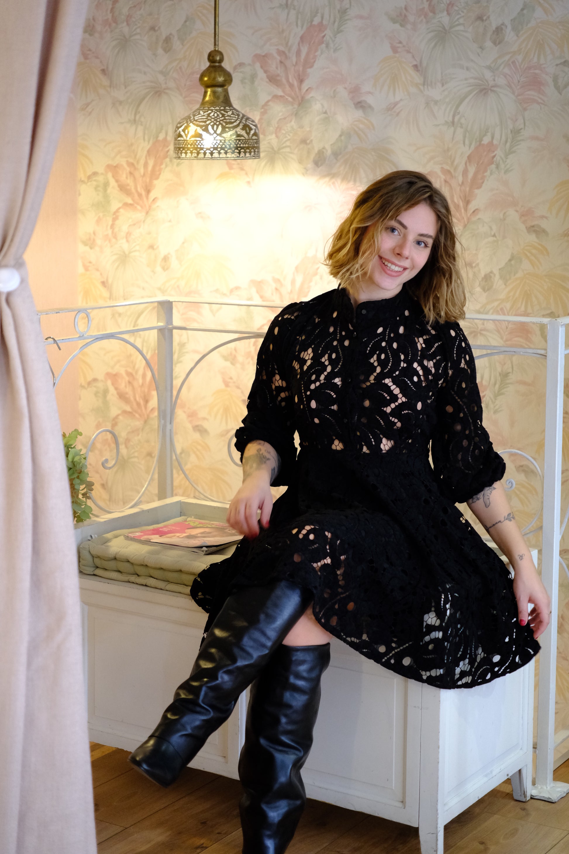 Abito corto dallo stile romantico e fresco, realizzato in stile sangallo che dona un effetto raffinato e femminile. La fodera interna dalla vita in giù assicura comfort e una perfetta vestibilità, mentre il design leggero e arioso lo rende ideale per la stagione estiva o per occasioni casual chic.