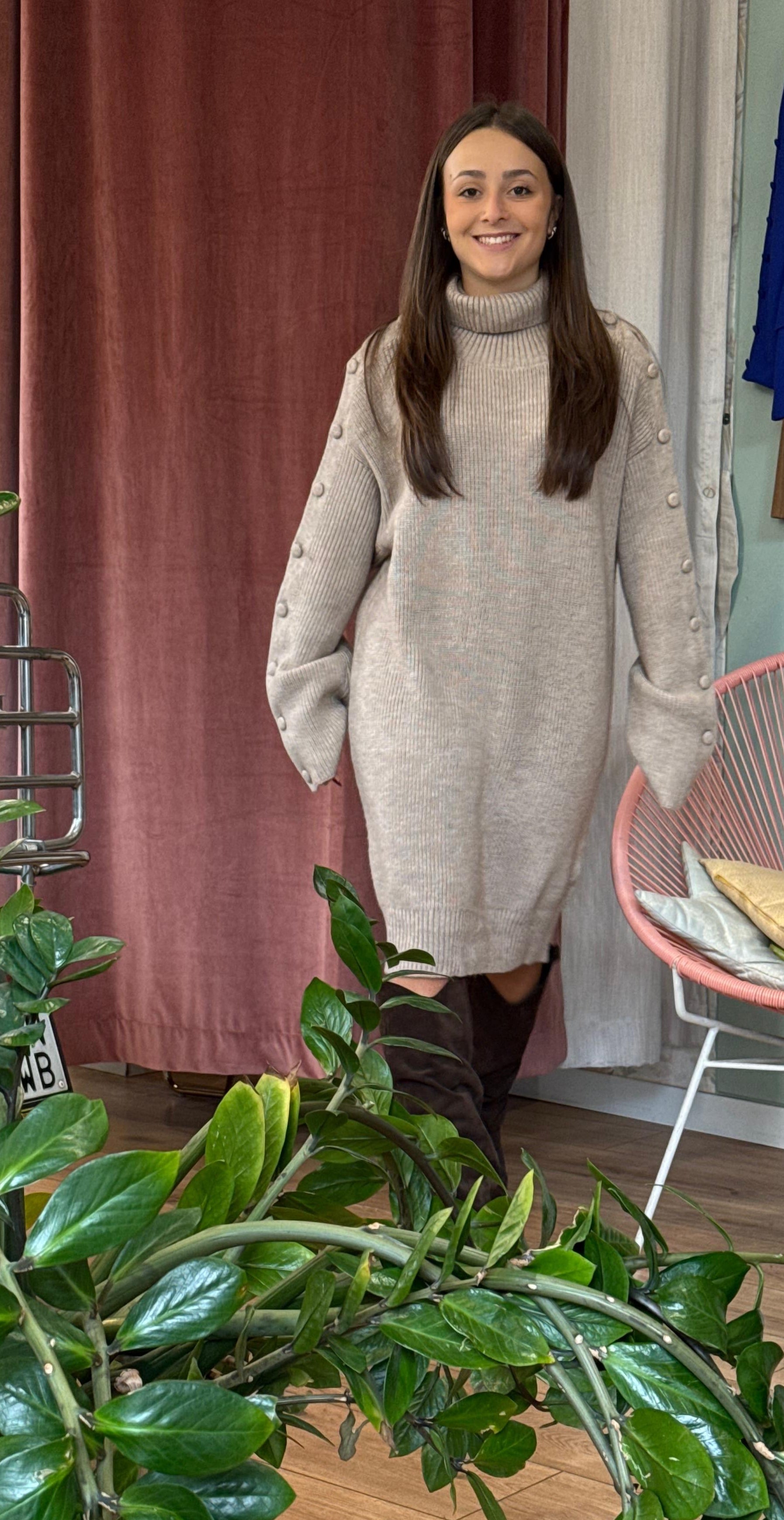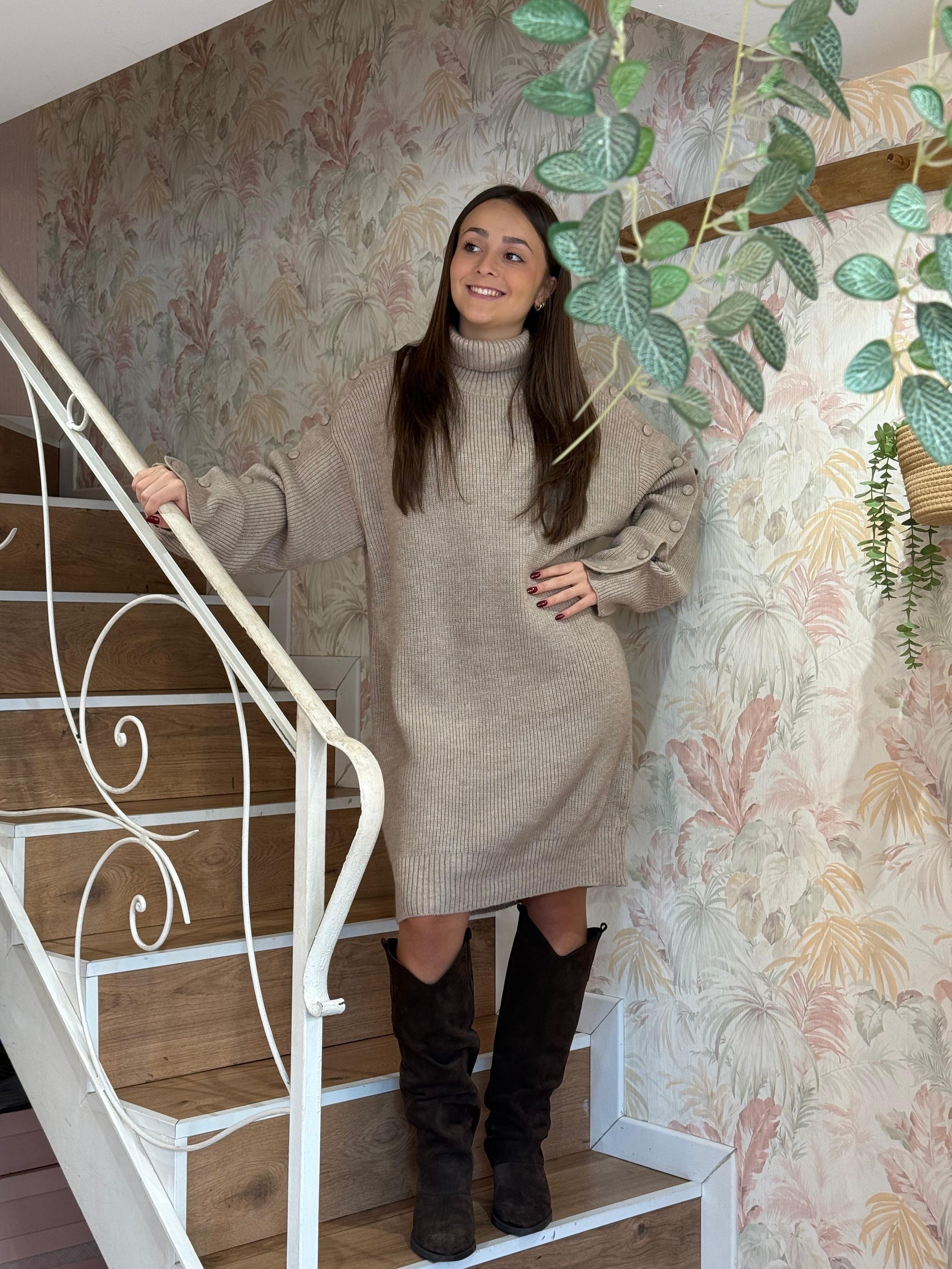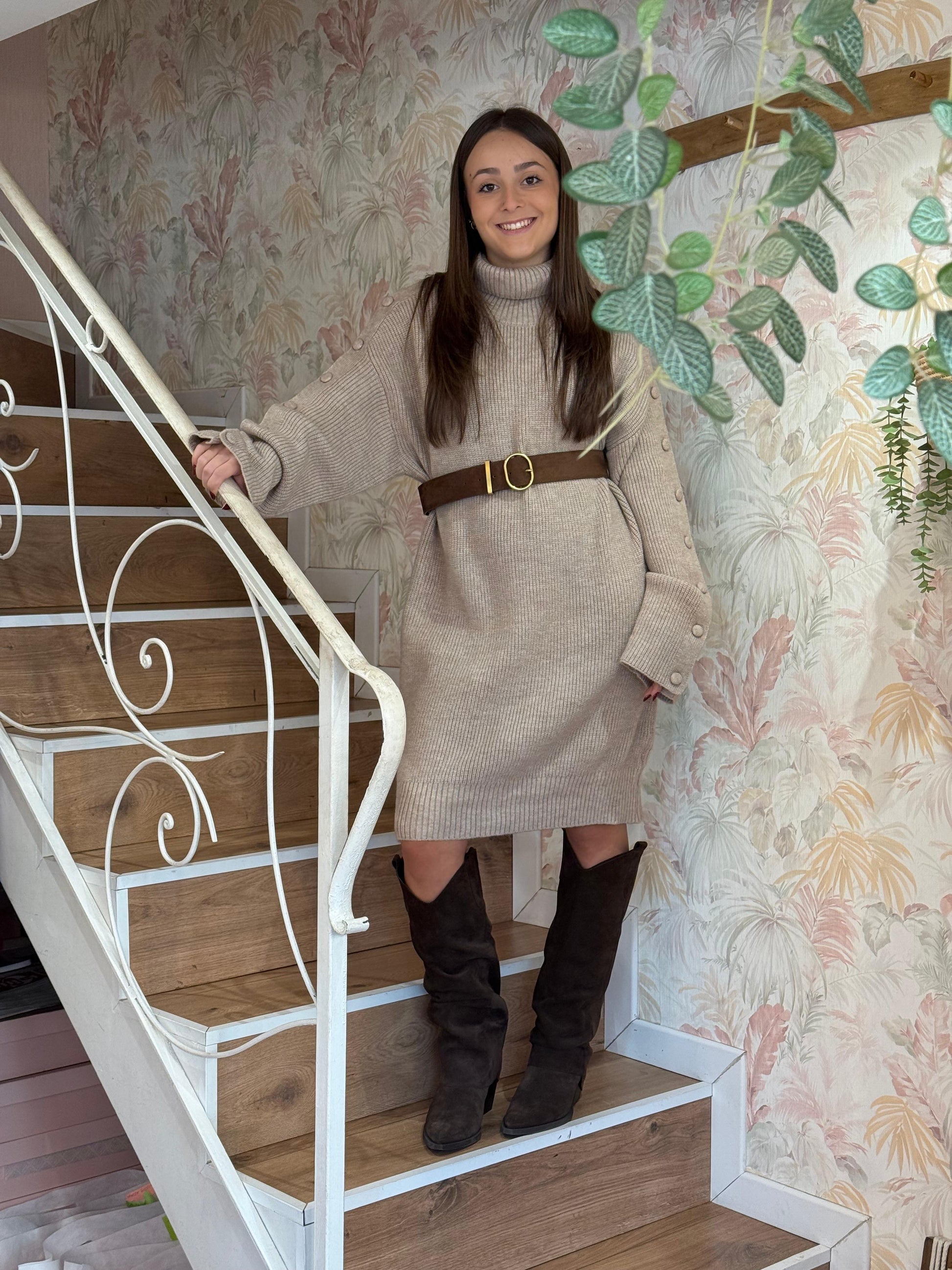 Elegante e avvolgente, questo abito in misto lana unisce comfort e stile in un design essenziale ma ricercato. Il collo a dolcevita e i bottoni decorativi sulle maniche aggiungono un tocco sofisticato, perfetto per la stagione fredda. Morbido al tatto e dalla vestibilità aderente, valorizza la silhouette con naturalezza.